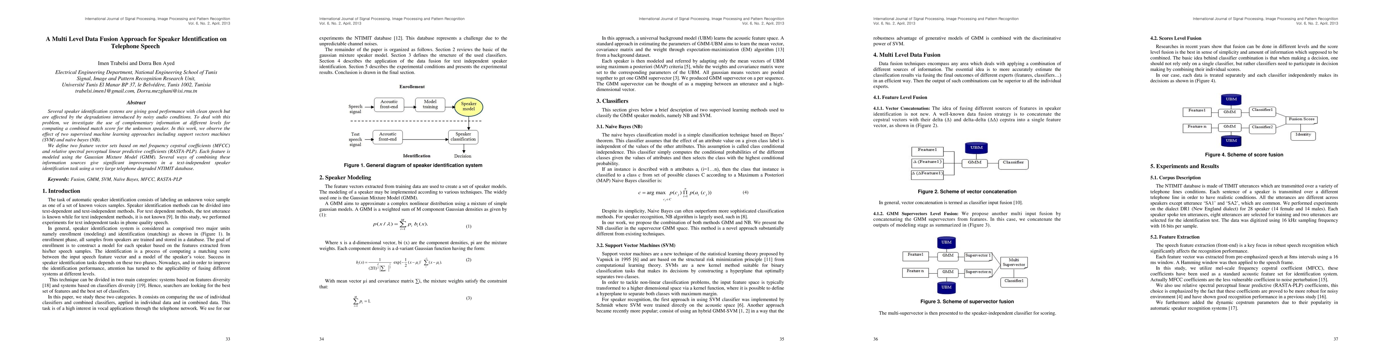 This paper proposes a multi-level data fusion approach for speaker identification in noisy telephone speech, utilizing complementary information from MFCC and RASTA-PLP features. It employs SVM and Naive Bayes for modeling and combines these features to achieve significant improvements in a large NTIMIT database.
