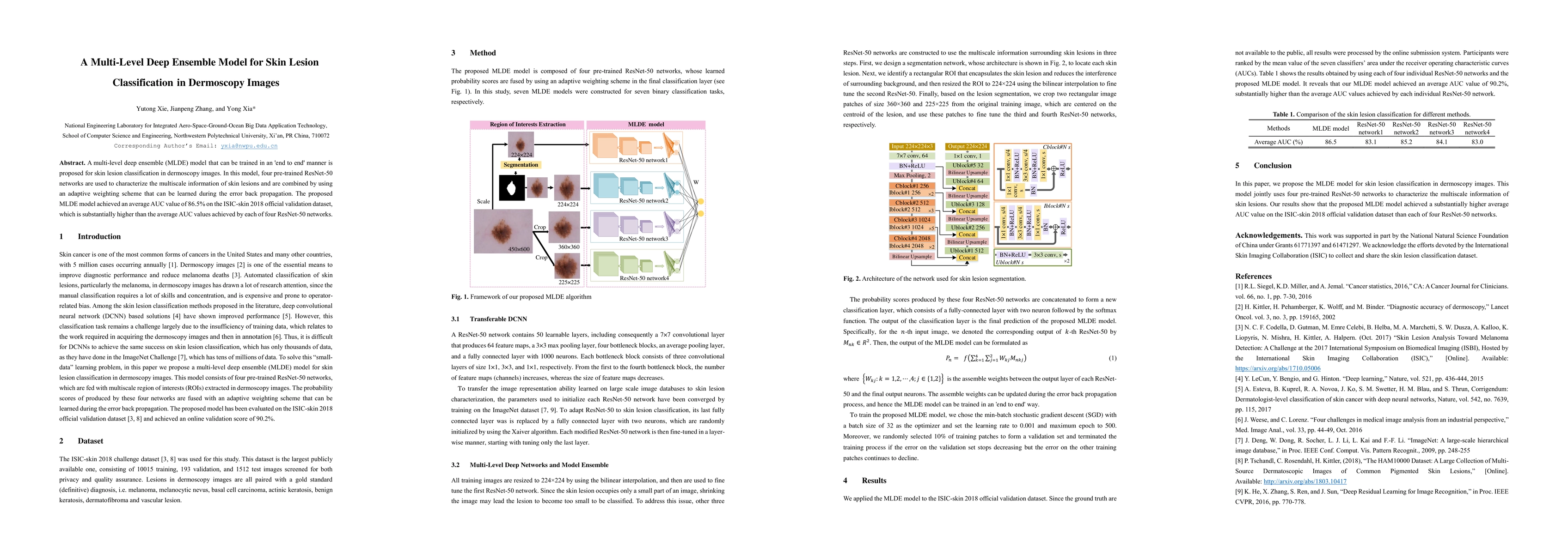 The paper proposes a multi-level deep ensemble model (MLDE) for skin lesion classification using dermoscopy images, combining four pre-trained ResNet-50 networks with an adaptive weighting scheme. The MLDE model achieved an average AUC value of 86.5% on the ISIC-skin 2018 validation dataset, outperforming individual ResNet-50 networks.
