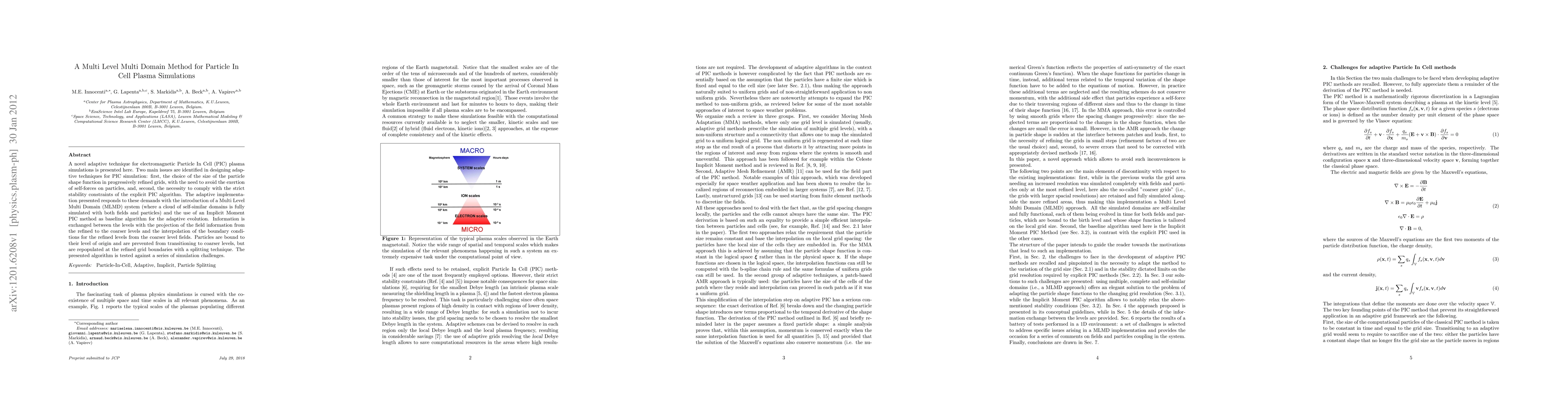 A novel adaptive technique for electromagnetic Particle In Cell (PIC) plasma simulations is presented here. Two main issues are identified in designing adaptive techniques for PIC simulation: first, the choice of the size of the particle shape function in progressively refined grids, with the need to avoid the exertion of self-forces on particles, and, second, the necessity to comply with the strict stability constraints of the explicit PIC algorithm. The adaptive implementation presented responds to these demands with the introduction of a Multi Level Multi Domain (MLMD) system (where a cloud of self-similar domains is fully simulated with both fields and particles) and the use of an Implicit Moment PIC method as baseline algorithm for the adaptive evolution. Information is exchanged between the levels with the projection of the field information from the refined to the coarser levels and the interpolation of the boundary conditions for the refined levels from the coarser level fields. Particles are bound to their level of origin and are prevented from transitioning to coarser levels, but are repopulated at the refined grid boundaries with a splitting technique. The presented algorithm is tested against a series of simulation challenges.