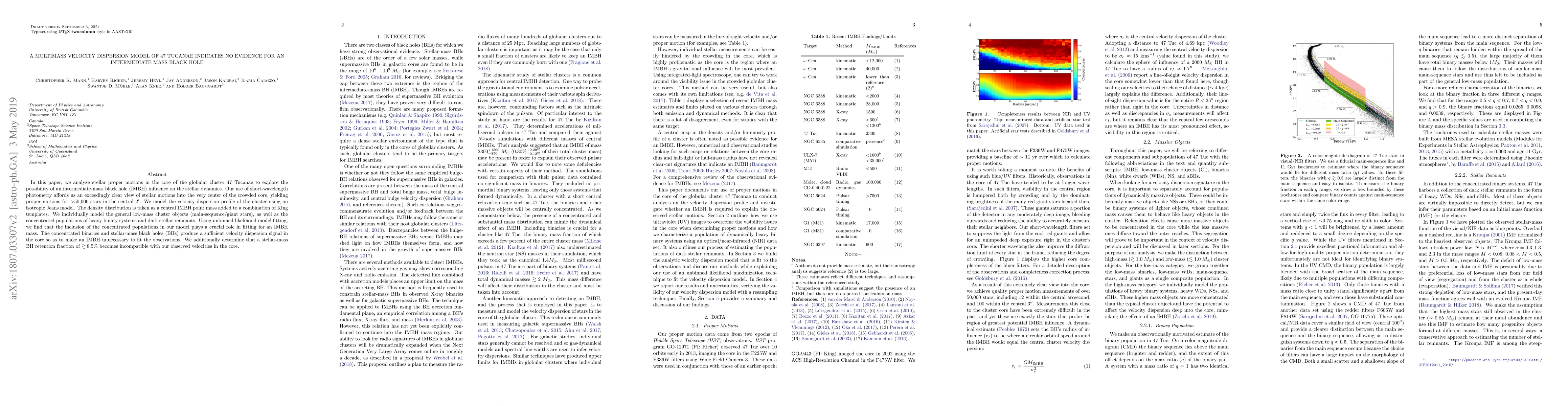 This study uses stellar proper motions in the globular cluster 47 Tucanae to investigate the presence of an intermediate-mass black hole (IMBH), finding no evidence for it. The concentrated populations of binaries and stellar-mass black holes sufficiently account for the observed velocity dispersion, making an IMBH unnecessary.