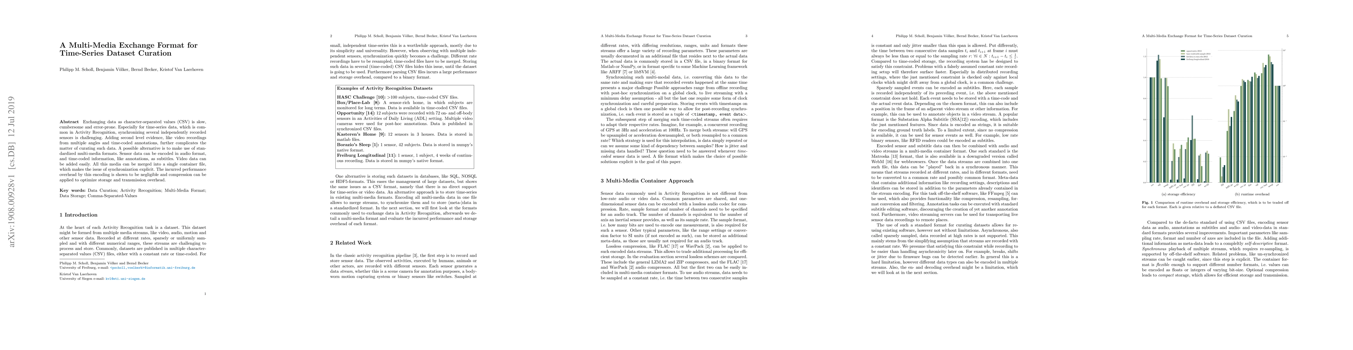 Exchanging data as character-separated values (CSV) is slow, cumbersome and error-prone. Especially for time-series data, which is common in Activity Recognition, synchronizing several independently recorded sensors is challenging. Adding second level evidence, like video recordings from multiple angles and time-coded annotations, further complicates the matter of curating such data. A possible alternative is to make use of standardized multi-media formats. Sensor data can be encoded in audio format, and time-coded information, like annotations, as subtitles. Video data can be added easily. All this media can be merged into a single container file, which makes the issue of synchronization explicit. The incurred performance overhead by this encoding is shown to be negligible and compression can be applied to optimize storage and transmission overhead.
