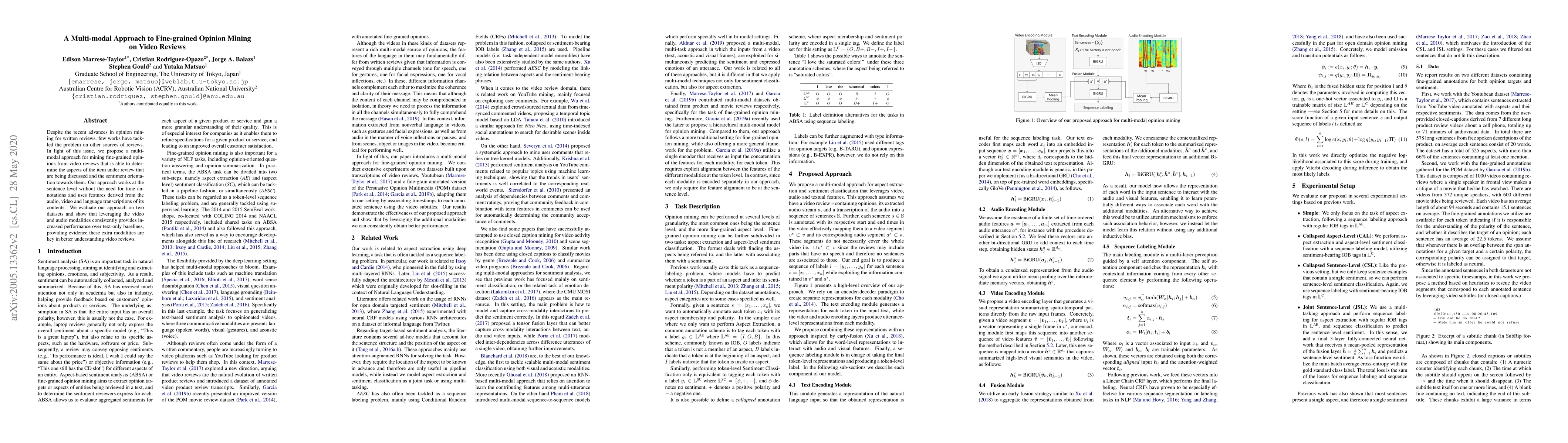 This paper proposes a multi-modal approach for fine-grained opinion mining in video reviews, leveraging audio, video, and language transcriptions to determine discussed aspects and sentiment. The method outperforms text-only baselines, demonstrating the importance of additional modalities in understanding video reviews.