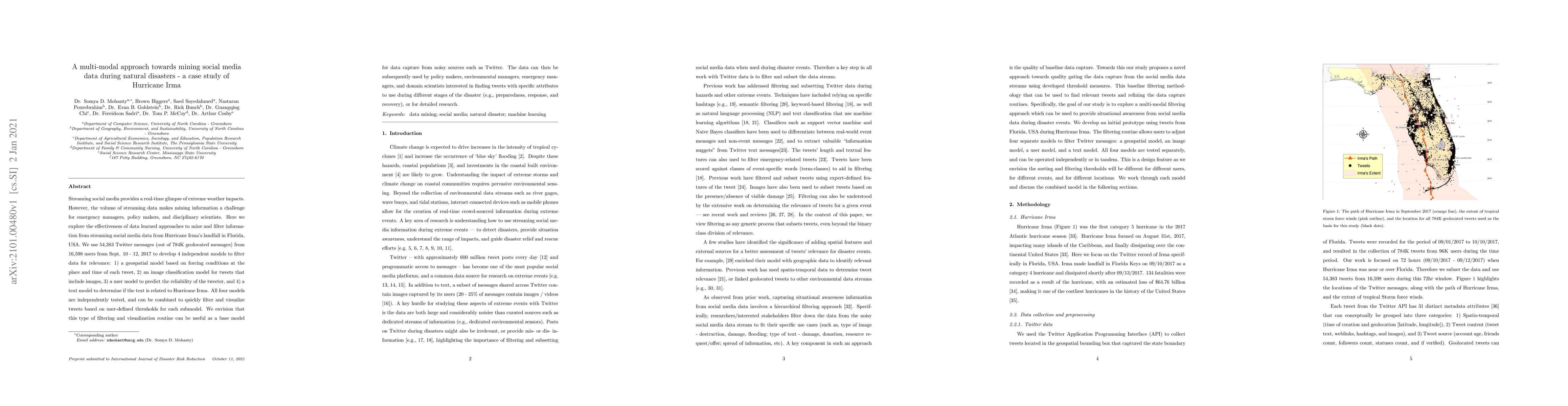 This paper presents a multi-modal approach to filter and analyze social media data during Hurricane Irma, using 4 independent models to assess geospatial relevance, image content, user reliability, and text relevance. The models aim to streamline the extraction of useful information from large volumes of Twitter data for emergency management and research purposes.