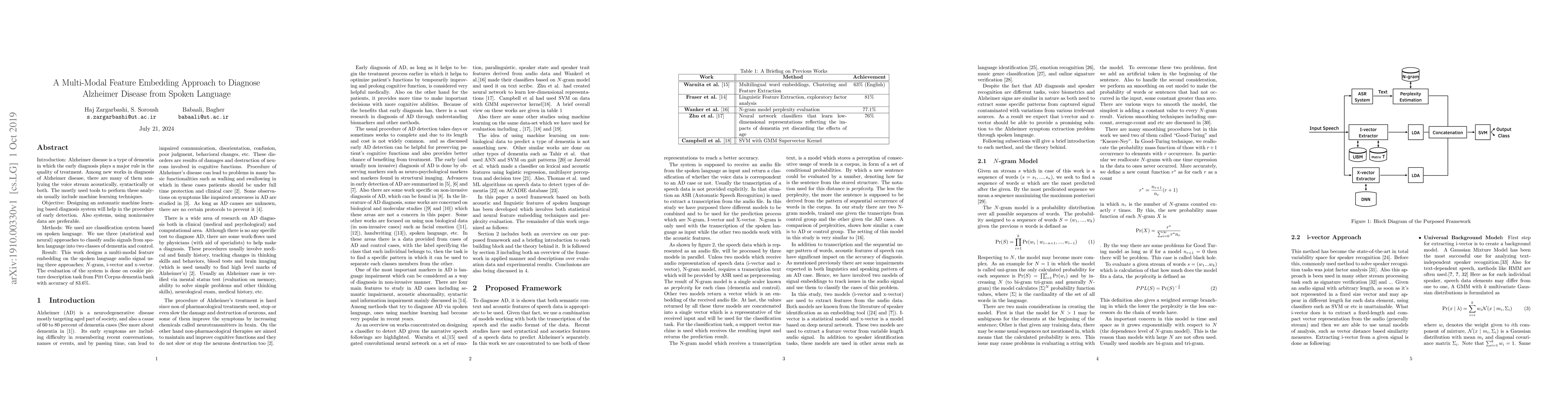 Introduction: Alzheimer's disease is a type of dementia in which early diagnosis plays a major rule in the quality of treatment. Among new works in the diagnosis of Alzheimer's disease, there are many of them analyzing the voice stream acoustically, syntactically or both. The mostly used tools to perform these analysis usually include machine learning techniques. Objective: Designing an automatic machine learning based diagnosis system will help in the procedure of early detection. Also, systems, using noninvasive data are preferable. Methods: We used are classification system based on spoken language. We use three (statistical and neural) approaches to classify audio signals from spoken language into two classes of dementia and control. Result: This work designs a multi-modal feature embedding on the spoken language audio signal using three approaches; N-gram, i-vector, and x-vector. The evaluation of the system is done on the cookie picture description task from Pitt Corpus dementia bank with the accuracy of 83:6