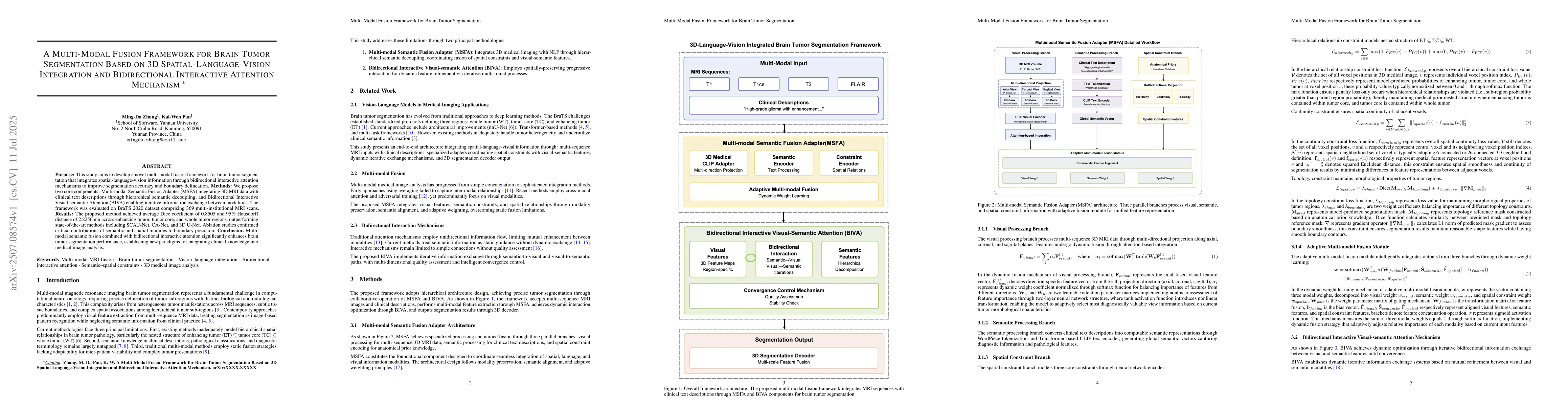 This study aims to develop a novel multi-modal fusion framework for brain tumor segmentation that integrates spatial-language-vision information through bidirectional interactive attention mechanisms to improve segmentation accuracy and boundary delineation. Methods: We propose two core components: Multi-modal Semantic Fusion Adapter (MSFA) integrating 3D MRI data with clinical text descriptions through hierarchical semantic decoupling, and Bidirectional Interactive Visual-semantic Attention (BIVA) enabling iterative information exchange between modalities. The framework was evaluated on BraTS 2020 dataset comprising 369 multi-institutional MRI scans. Results: The proposed method achieved average Dice coefficient of 0.8505 and 95% Hausdorff distance of 2.8256mm across enhancing tumor, tumor core, and whole tumor regions, outperforming state-of-the-art methods including SCAU-Net, CA-Net, and 3D U-Net. Ablation studies confirmed critical contributions of semantic and spatial modules to boundary precision. Conclusion: Multi-modal semantic fusion combined with bidirectional interactive attention significantly enhances brain tumor segmentation performance, establishing new paradigms for integrating clinical knowledge into medical image analysis.