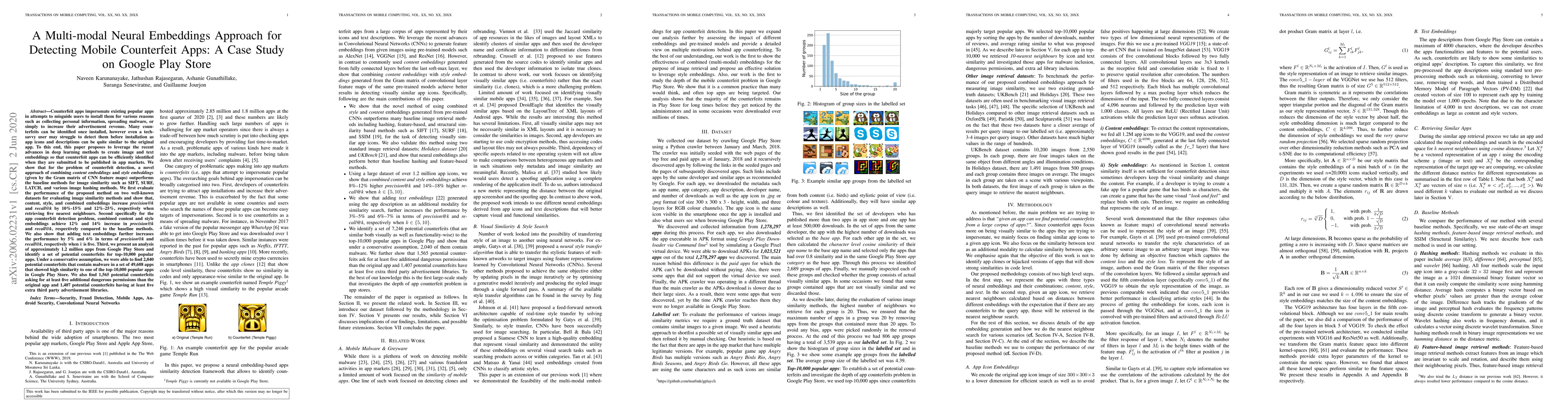 This paper proposes a multi-modal neural embeddings approach combining content and style embeddings to detect counterfeit mobile apps on the Google Play Store. The method outperforms traditional image similarity techniques and identifies potential counterfeits with malware, excessive permissions, and ad libraries.