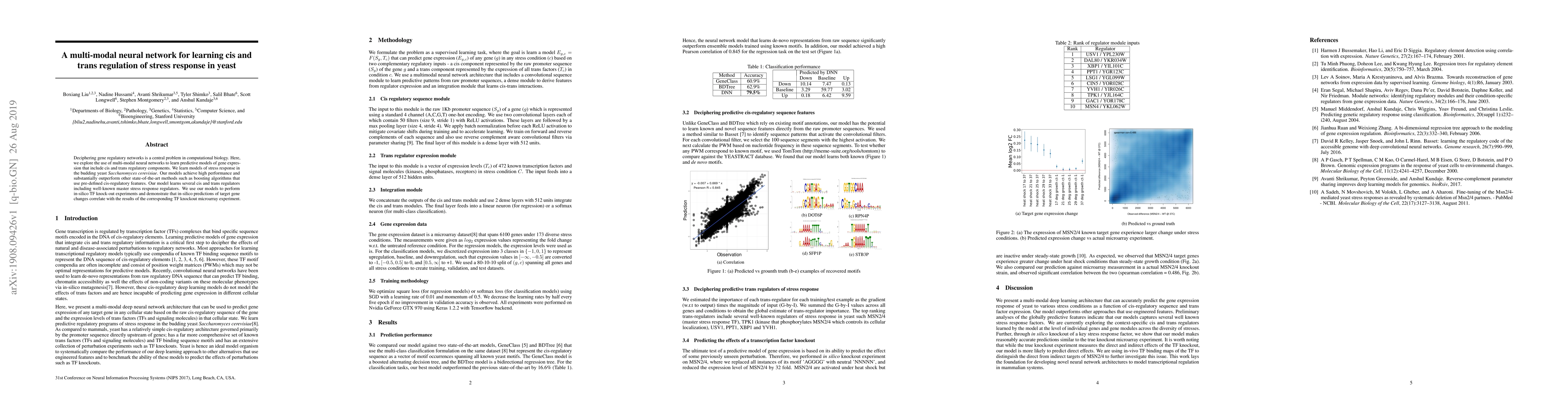 This paper develops a multi-modal neural network to predict gene expression in yeast's stress response, incorporating both cis and trans regulatory elements. The model outperforms existing methods, accurately identifying key regulators and validating predictions through in-silico TF knock-out experiments.