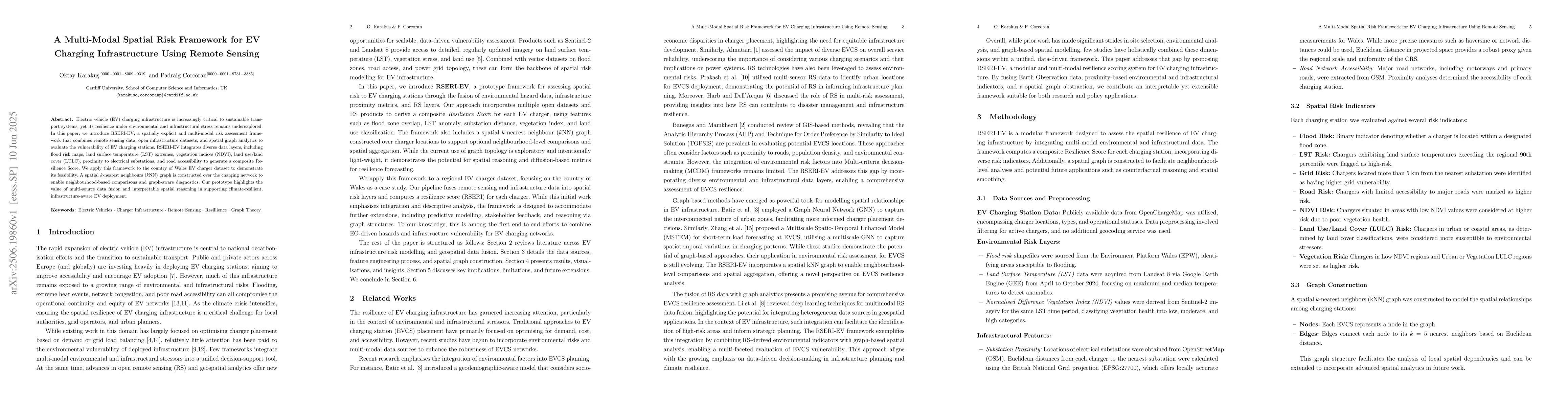 Electric vehicle (EV) charging infrastructure is increasingly critical to sustainable transport systems, yet its resilience under environmental and infrastructural stress remains underexplored. In this paper, we introduce RSERI-EV, a spatially explicit and multi-modal risk assessment framework that combines remote sensing data, open infrastructure datasets, and spatial graph analytics to evaluate the vulnerability of EV charging stations. RSERI-EV integrates diverse data layers, including flood risk maps, land surface temperature (LST) extremes, vegetation indices (NDVI), land use/land cover (LULC), proximity to electrical substations, and road accessibility to generate a composite Resilience Score. We apply this framework to the country of Wales EV charger dataset to demonstrate its feasibility. A spatial $k$-nearest neighbours ($k$NN) graph is constructed over the charging network to enable neighbourhood-based comparisons and graph-aware diagnostics. Our prototype highlights the value of multi-source data fusion and interpretable spatial reasoning in supporting climate-resilient, infrastructure-aware EV deployment.