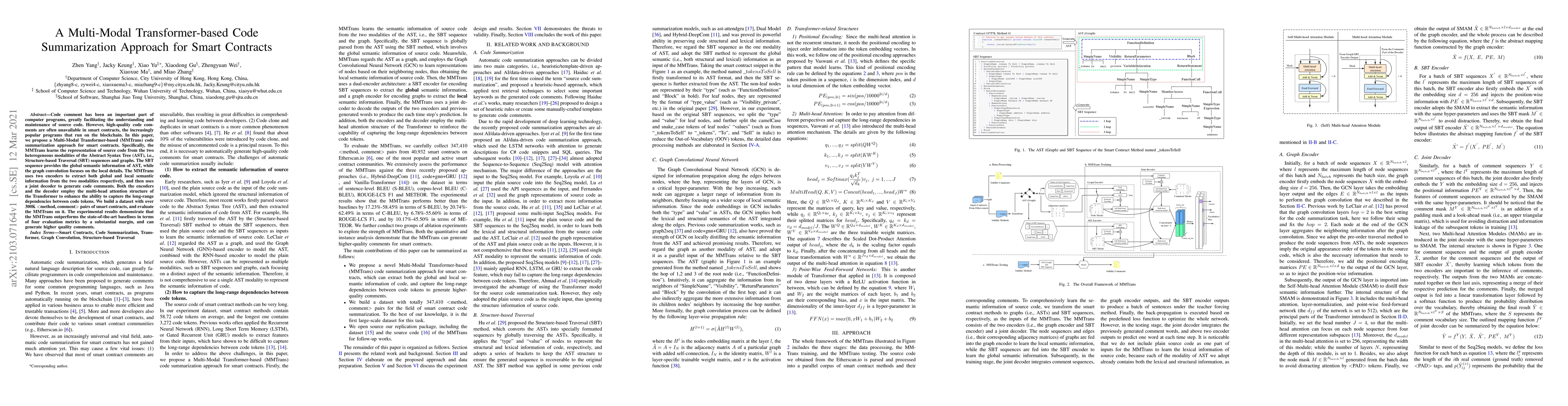 This paper proposes a Multi-Modal Transformer-based (MMTrans) approach for summarizing smart contracts by generating high-quality code comments. The MMTrans leverages both structure-based traversal sequences and graph convolution for capturing global and local semantics, respectively.