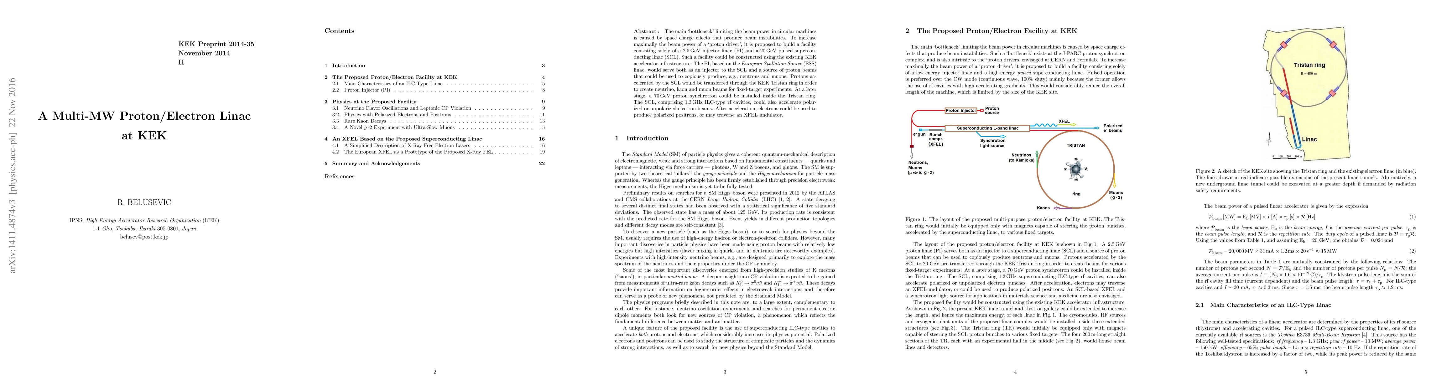 The main `bottleneck' limiting the beam power in circular machines is caused by space charge effects that produce beam instabilities. To increase maximally the beam power of a `proton driver', it is proposed to build a facility consisting solely of a 2.5-GeV injector linac (PI) and a 20-GeV pulsed superconducting linac (SCL). Such a facility could be constructed using the existing KEK accelerator infrastructure. The PI, based on the European Spallation Source (ESS) linac, would serve both as an injector to the SCL and a source of proton beams that could be used to copiously produce, e.g., neutrons and muons. Protons accelerated by the SCL would be transferred through the KEK Tristan ring in order to create neutrino, kaon and muon beams for fixed-target experiments. At a later stage, a 70-GeV proton synchrotron could be installed inside the Tristan ring. The SCL, comprising 1.3-GHz ILC-type rf cavities, could also accelerate polarized or unpolarized electron beams. After acceleration, electrons could be used to produce polarized positrons, or may traverse an XFEL undulator.