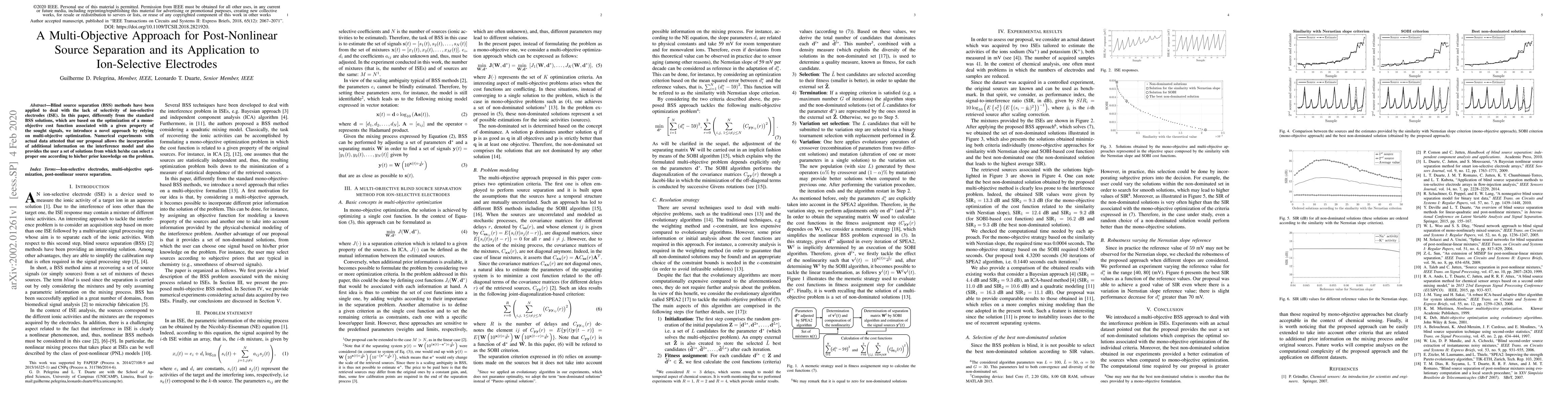 This paper presents a multi-objective approach for post-nonlinear source separation applied to ion-selective electrodes, offering a set of solutions based on optimization of multiple objectives rather than a single cost function, allowing users to select the best solution based on their prior knowledge. Numerical experiments demonstrate its effectiveness in handling interference and improving electrode selectivity.