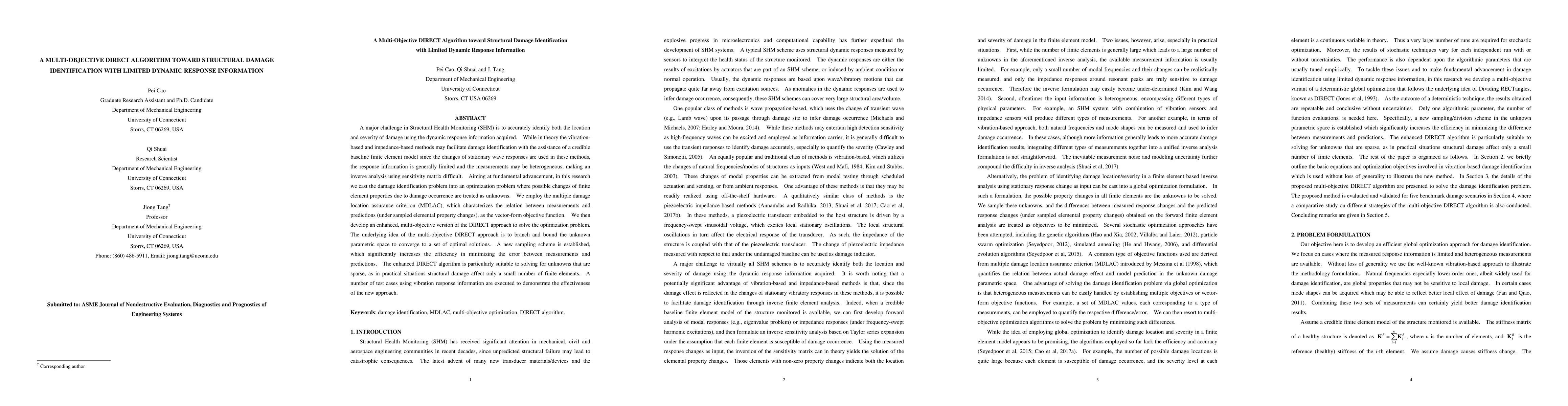This research proposes a multi-objective DIRECT algorithm for structural damage identification using limited dynamic response data. The method optimizes finite element property changes by treating them as unknowns, employing the MDLAC to characterize measurement-prediction relations, and efficiently minimizing errors through an enhanced DIRECT approach. The algorithm is validated through test cases demonstrating its effectiveness in identifying sparse damage locations.