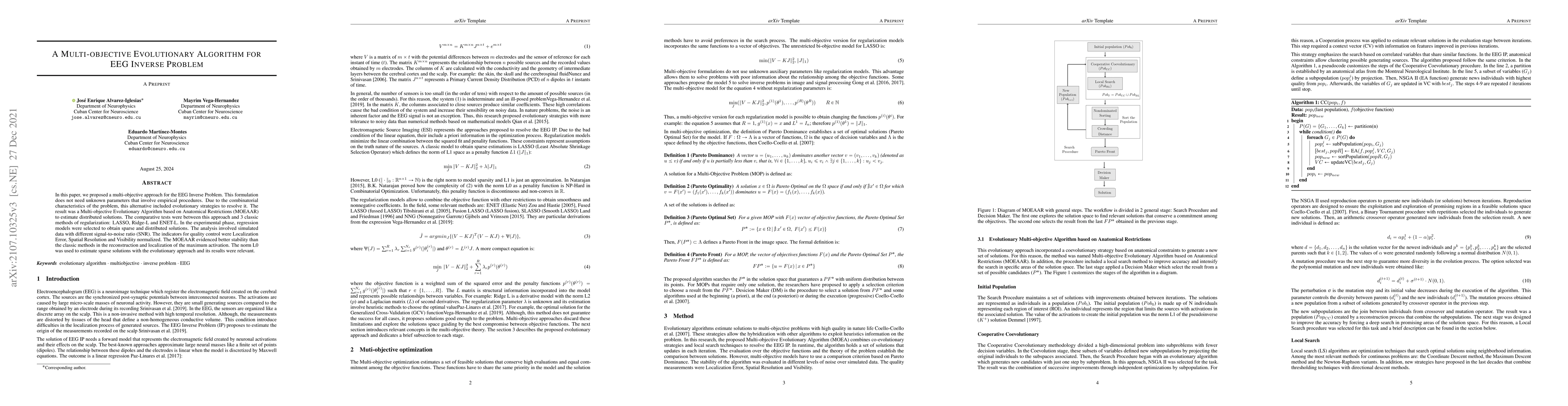 In this paper, we proposed a multi-objective approach for the EEG Inverse Problem. This formulation does not need unknown parameters that involve empirical procedures. Due to the combinatorial characteristics of the problem, this alternative included evolutionary strategies to resolve it. The result is a Multi-objective Evolutionary Algorithm based on Anatomical Restrictions (MOEAAR) to estimate distributed solutions. The comparative tests were between this approach and 3 classic methods of regularization: LASSO, Ridge-L and ENET-L. In the experimental phase, regression models were selected to obtain sparse and distributed solutions. The analysis involved simulated data with different signal-to-noise ratio (SNR). The indicators for quality control were Localization Error, Spatial Resolution and Visibility. The MOEAAR evidenced better stability than the classic methods in the reconstruction and localization of the maximum activation. The norm L0 was used to estimate sparse solutions with the evolutionary approach and its results were relevant.