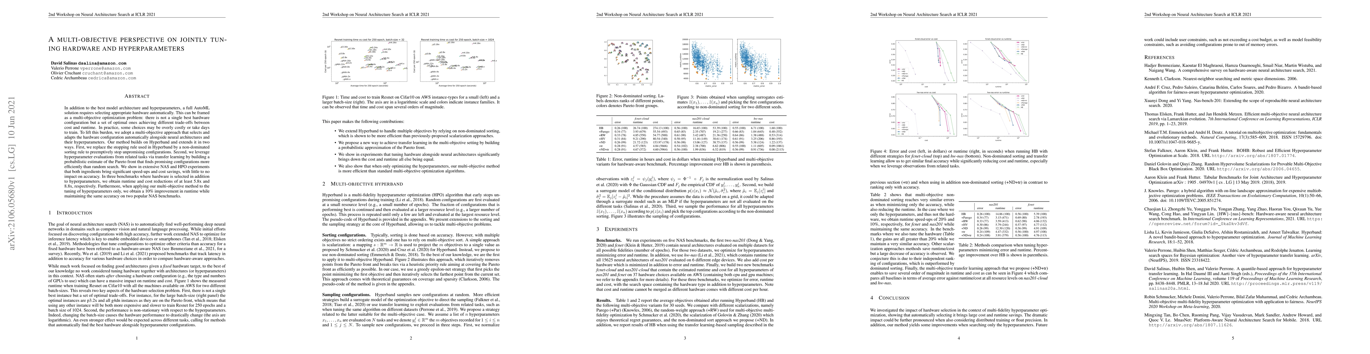 In addition to the best model architecture and hyperparameters, a full AutoML solution requires selecting appropriate hardware automatically. This can be framed as a multi-objective optimization problem: there is not a single best hardware configuration but a set of optimal ones achieving different trade-offs between cost and runtime. In practice, some choices may be overly costly or take days to train. To lift this burden, we adopt a multi-objective approach that selects and adapts the hardware configuration automatically alongside neural architectures and their hyperparameters. Our method builds on Hyperband and extends it in two ways. First, we replace the stopping rule used in Hyperband by a non-dominated sorting rule to preemptively stop unpromising configurations. Second, we leverage hyperparameter evaluations from related tasks via transfer learning by building a probabilistic estimate of the Pareto front that finds promising configurations more efficiently than random search. We show in extensive NAS and HPO experiments that both ingredients bring significant speed-ups and cost savings, with little to no impact on accuracy. In three benchmarks where hardware is selected in addition to hyperparameters, we obtain runtime and cost reductions of at least 5.8x and 8.8x, respectively. Furthermore, when applying our multi-objective method to the tuning of hyperparameters only, we obtain a 10\% improvement in runtime while maintaining the same accuracy on two popular NAS benchmarks.