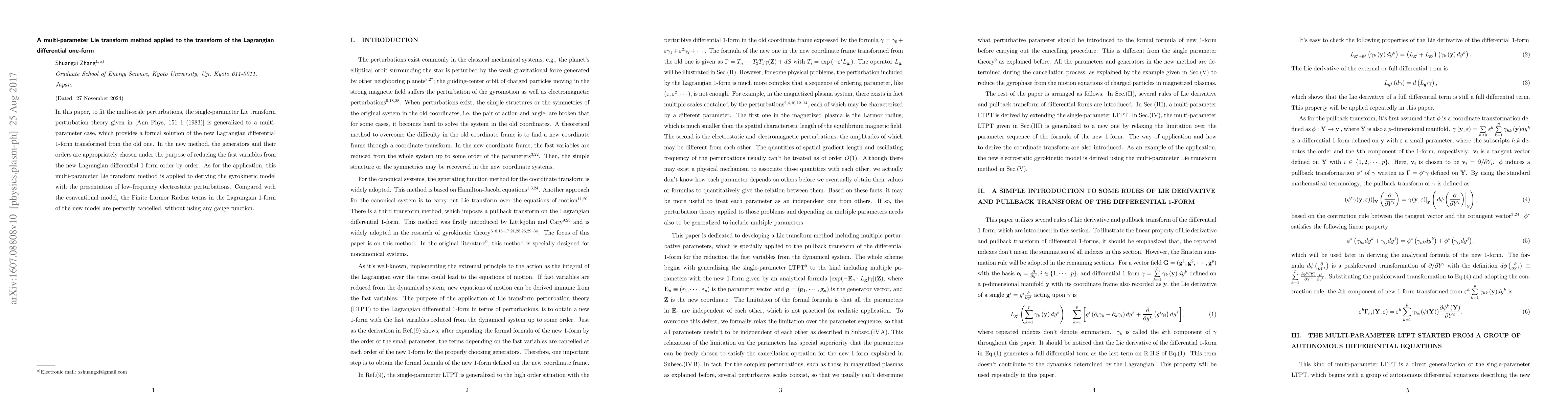 In this paper, to fit the multi-scale perturbations, the single-parameter Lie transform perturbation theory given in [Ann Phys, 151 1 (1983)] is generalized to a multi-parameter case, which provides a formal solution of the new Lagrangian differential 1-form transformed from the old one. In the new method, the generators and their orders are appropriately chosen under the purpose of reducing the fast variables from the new Lagrangian differential 1-form order by order. As for the application, this multi-parameter Lie transform method is applied to deriving the gyrokinetic model with the presentation of low-frequency electrostatic perturbations. Compared with the conventional model, the Finite Larmor Radius terms in the Lagrangian 1-form of the new model are perfectly cancelled, without using any gauge function.