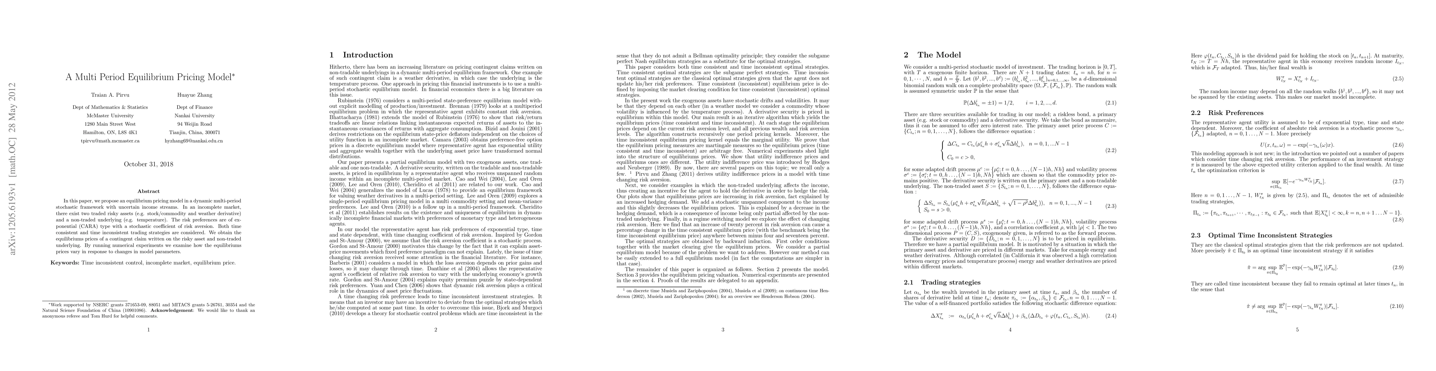 This paper proposes a pricing model for equilibriums prices in a dynamic multi-period framework with uncertain income streams, focusing on time consistent and time inconsistent trading strategies and their implications.