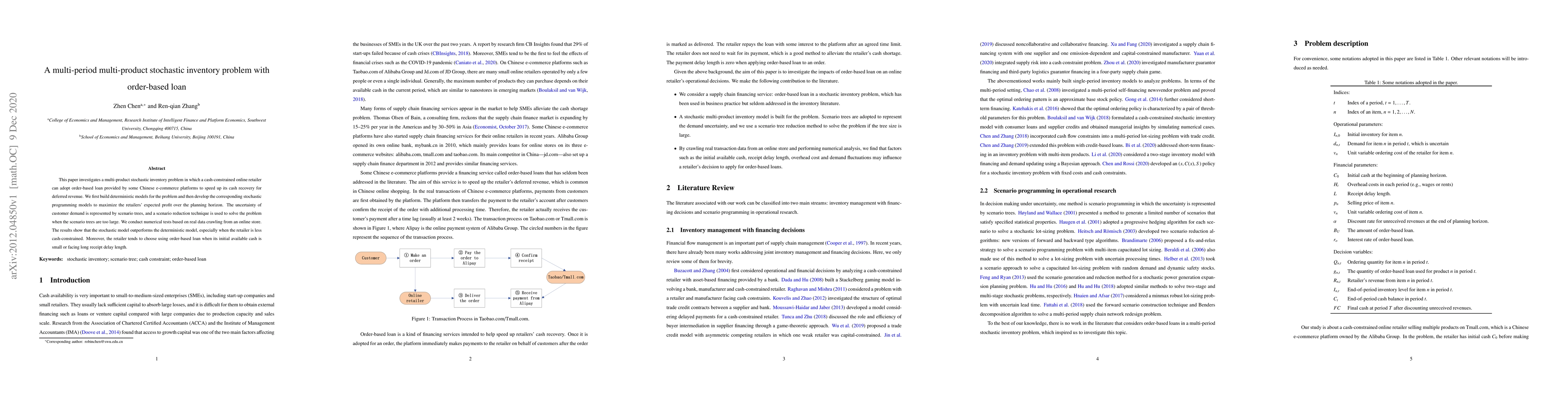 This paper investigates a multi-product stochastic inventory problem in which a cash-constrained online retailer can adopt order-based loan provided by some Chinese e-commerce platforms to speed up its cash recovery for deferred revenue. We first build deterministic models for the problem and then develop the corresponding stochastic programming models to maximize the retailers' expected profit over the planning horizon. The uncertainty of customer demand is represented by scenario trees, and a scenario reduction technique is used to solve the problem when the scenario trees are too large. We conduct numerical tests based on real data crawling from an online store. The results show that the stochastic model outperforms the deterministic model, especially when the retailer is less cash-constrained. Moreover, the retailer tends to choose using order-based loan when its initial available cash is small or facing long receipt delay length.