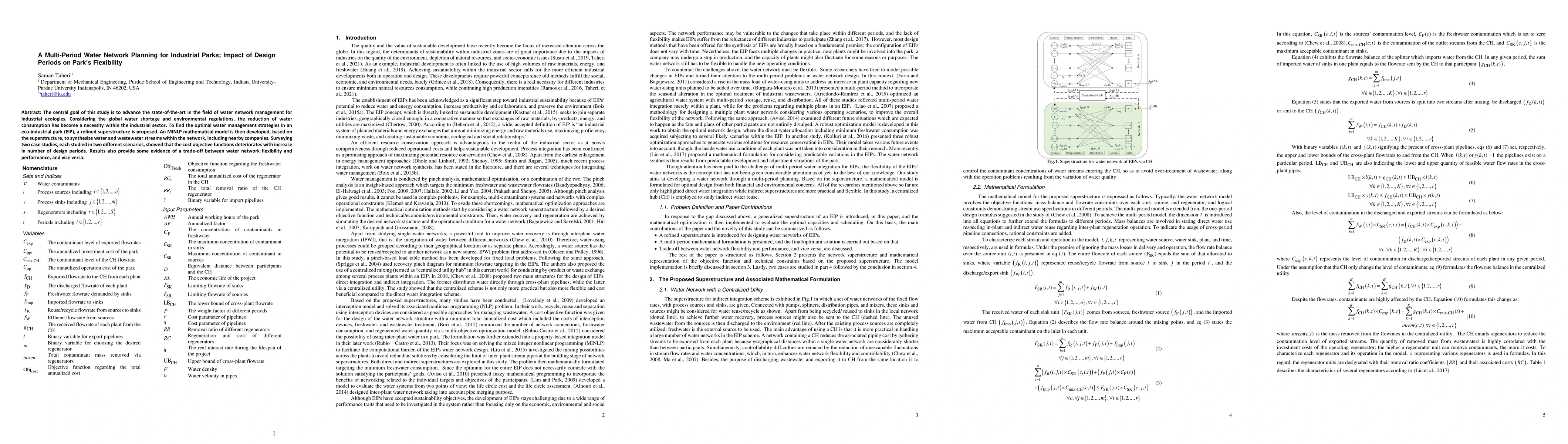 The central goal of this study is to advance the state-of-the-art in the field of water network management for industrial ecologies. Considering the global water shortage and environmental regulations, the reduction of water consumption has become a necessity within the industrial sector. To find the optimal water management strategies in an eco-industrial park (EIP), a refined superstructure is proposed. An MINLP mathematical model is then developed, based on the superstructure, to synthesize water and wastewater streams within the network, including nearby companies. Surveying two case studies, each studied in two different scenarios, showed that the cost objective functions deteriorates with increase in number of design periods. Results also provide some evidence of a trade-off between water network flexibility and performance, and vice versa.