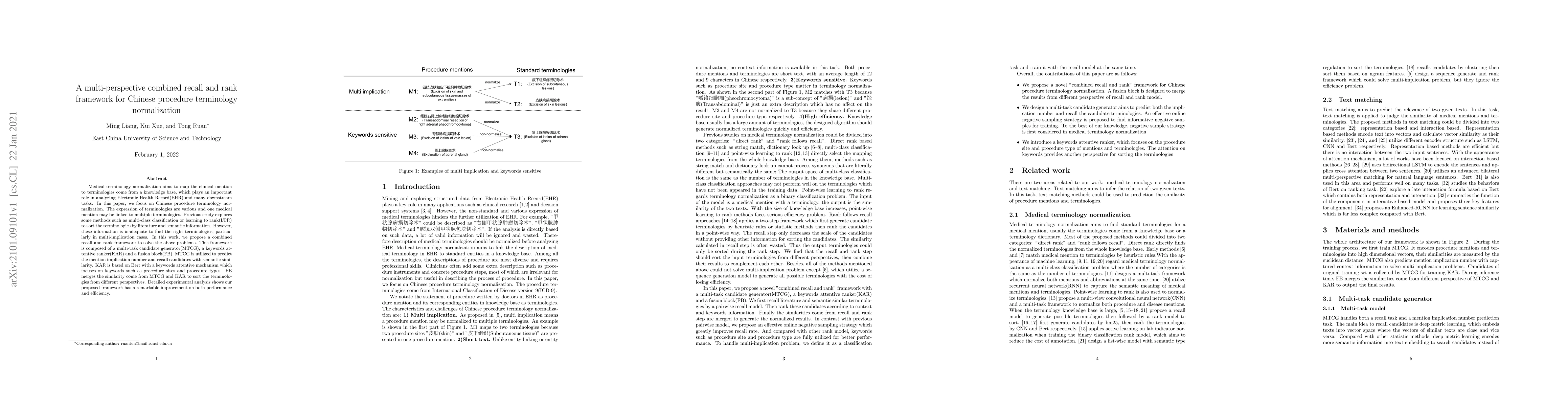 Medical terminology normalization aims to map the clinical mention to terminologies come from a knowledge base, which plays an important role in analyzing Electronic Health Record(EHR) and many downstream tasks. In this paper, we focus on Chinese procedure terminology normalization. The expression of terminologies are various and one medical mention may be linked to multiple terminologies. Previous study explores some methods such as multi-class classification or learning to rank(LTR) to sort the terminologies by literature and semantic information. However, these information is inadequate to find the right terminologies, particularly in multi-implication cases. In this work, we propose a combined recall and rank framework to solve the above problems. This framework is composed of a multi-task candidate generator(MTCG), a keywords attentive ranker(KAR) and a fusion block(FB). MTCG is utilized to predict the mention implication number and recall candidates with semantic similarity. KAR is based on Bert with a keywords attentive mechanism which focuses on keywords such as procedure sites and procedure types. FB merges the similarity come from MTCG and KAR to sort the terminologies from different perspectives. Detailed experimental analysis shows our proposed framework has a remarkable improvement on both performance and efficiency.