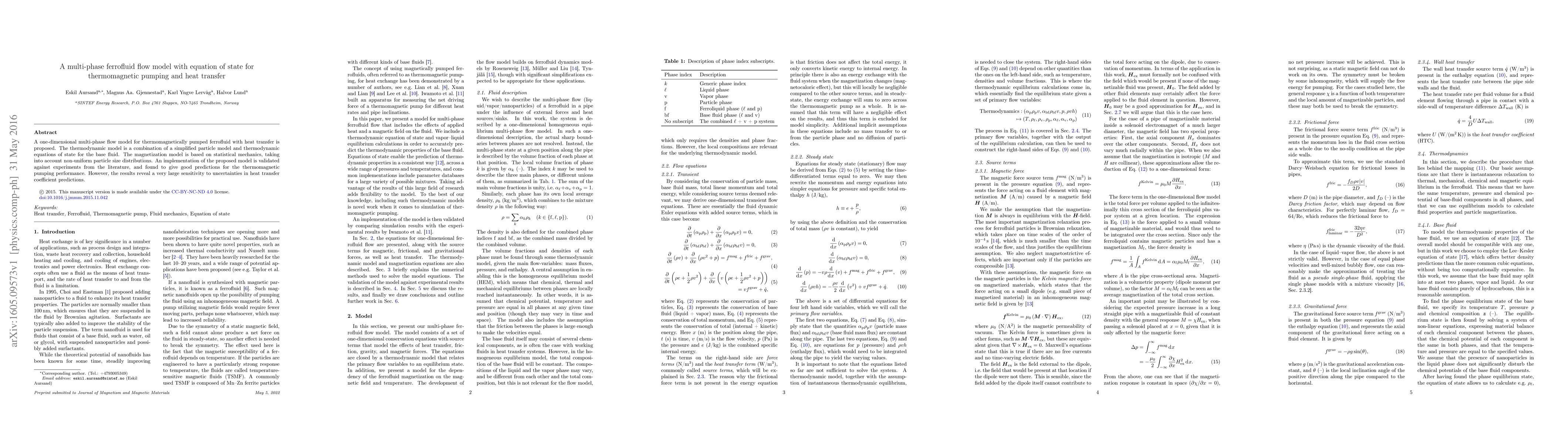This paper proposes a one-dimensional multi-phase flow model for thermomagnetically pumped ferrofluid, combining simplified particle models with thermodynamic equations of state. The model's magnetization is based on statistical mechanics, accounting for non-uniform particle sizes, and is validated against experimental data, showing good predictions for thermomagnetic pumping performance but high sensitivity to heat transfer uncertainties.