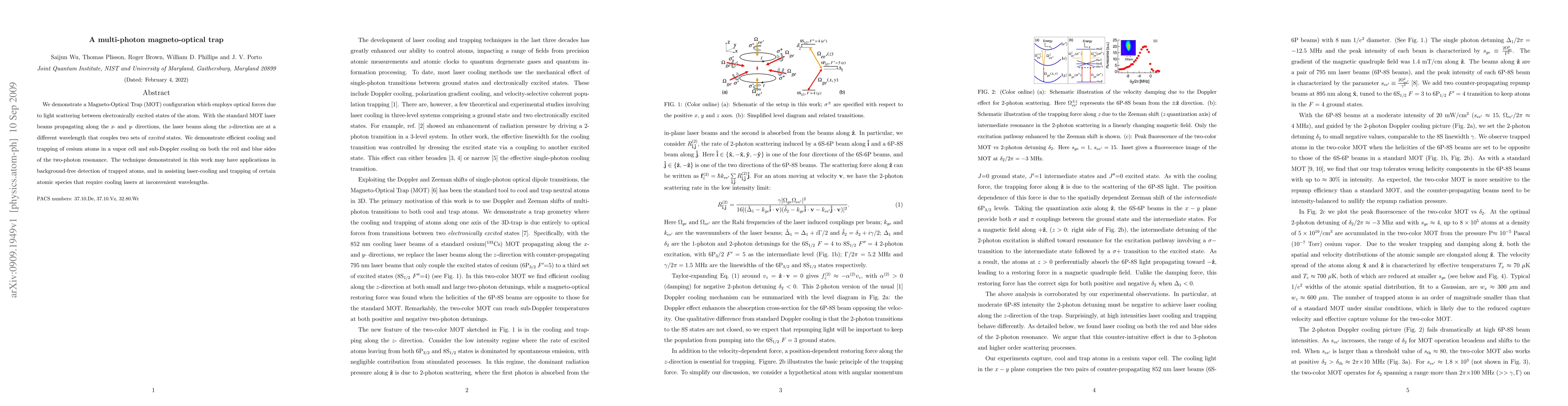 We demonstrate a Magneto-Optical Trap (MOT) configuration which employs optical forces due to light scattering between electronically excited states of the atom. With the standard MOT laser beams propagating along the {\it x}- and {\it y}- directions, the laser beams along the {\it z}-direction are at a different wavelength that couples two sets of {\it excited} states. We demonstrate efficient cooling and trapping of cesium atoms in a vapor cell and sub-Doppler cooling on both the red and blue sides of the two-photon resonance. The technique demonstrated in this work may have applications in background-free detection of trapped atoms, and in assisting laser-cooling and trapping of certain atomic species that require cooling lasers at inconvenient wavelengths.