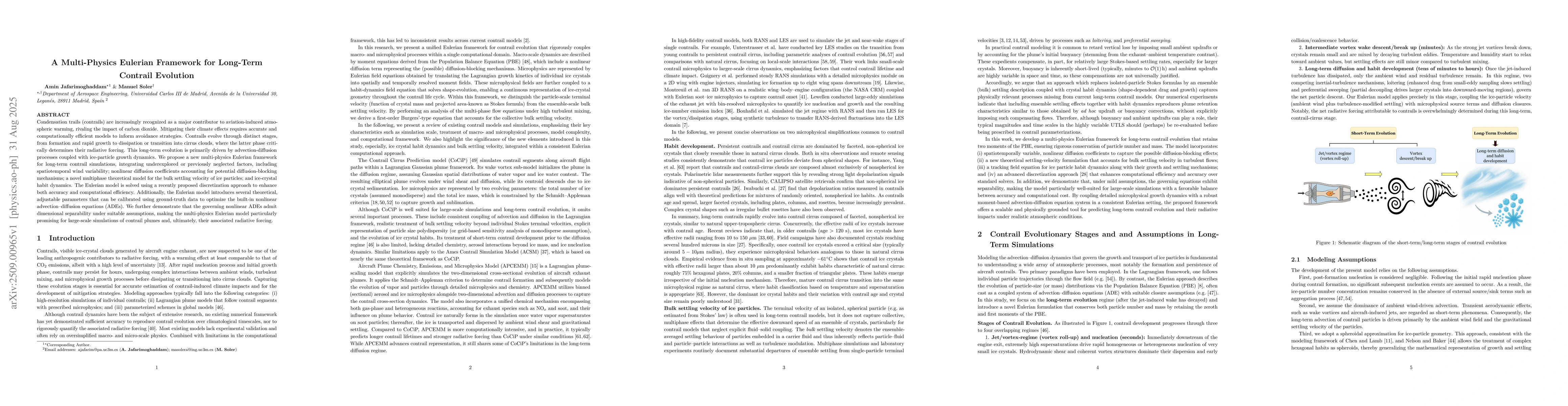 Condensation trails (contrails) are increasingly recognized as a major contributor to aviation-induced atmospheric warming, rivaling the impact of carbon dioxide. Mitigating their climate effects requires accurate and computationally efficient models to inform avoidance strategies. Contrails evolve through distinct stages, from formation and rapid growth to dissipation or transition into cirrus clouds, where the latter phase critically determines their radiative forcing. This long-term evolution is primarily driven by advection-diffusion processes coupled with ice-particle growth dynamics. We propose a new multi-physics Eulerian framework for long-term contrail simulations, integrating underexplored or previously neglected factors, including spatiotemporal wind variability; nonlinear diffusion coefficients accounting for potential diffusion-blocking mechanisms; a novel multiphase theoretical model for the bulk settling velocity of ice particles; and ice-crystal habit dynamics. The Eulerian model is solved using a recently proposed discretization approach to enhance both accuracy and computational efficiency. Additionally, the Eulerian model introduces several theoretical, adjustable parameters that can be calibrated using ground-truth data to optimize the built-in nonlinear advection-diffusion equations (ADEs). We further demonstrate that the governing nonlinear ADEs admit dimensional separability under suitable assumptions, making the multi-physics Eulerian model particularly promising for large-scale simulations of contrail plumes and, ultimately, their associated radiative forcing.