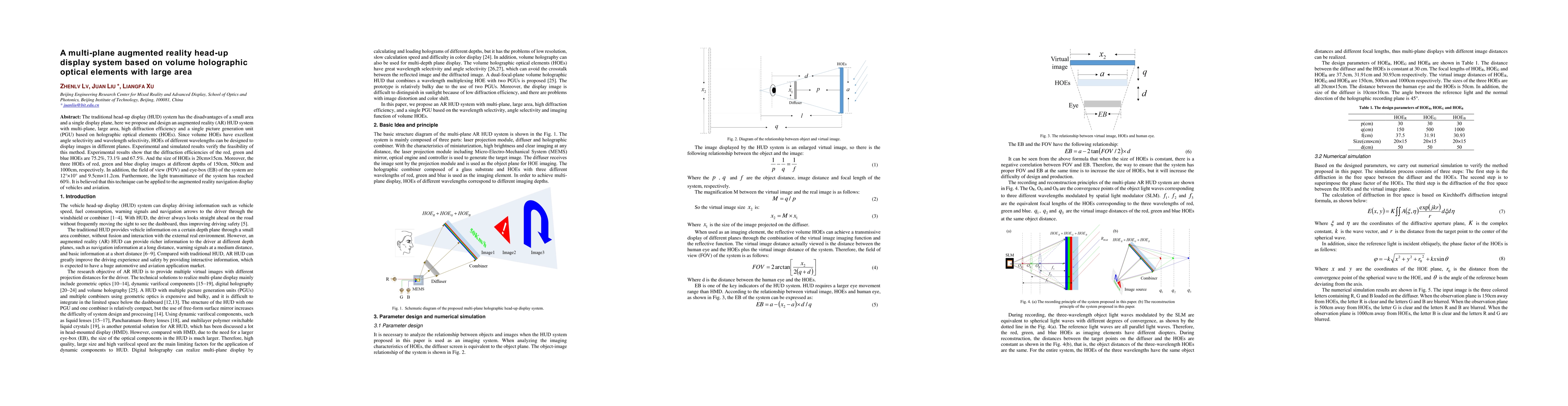 This paper proposes a multi-plane augmented reality head-up display system utilizing large area volume holographic optical elements (HOEs) for high diffraction efficiency and single picture generation. Experimental results show high diffraction efficiencies and the ability to display images at different depths, suggesting potential applications in vehicle and aviation navigation displays.