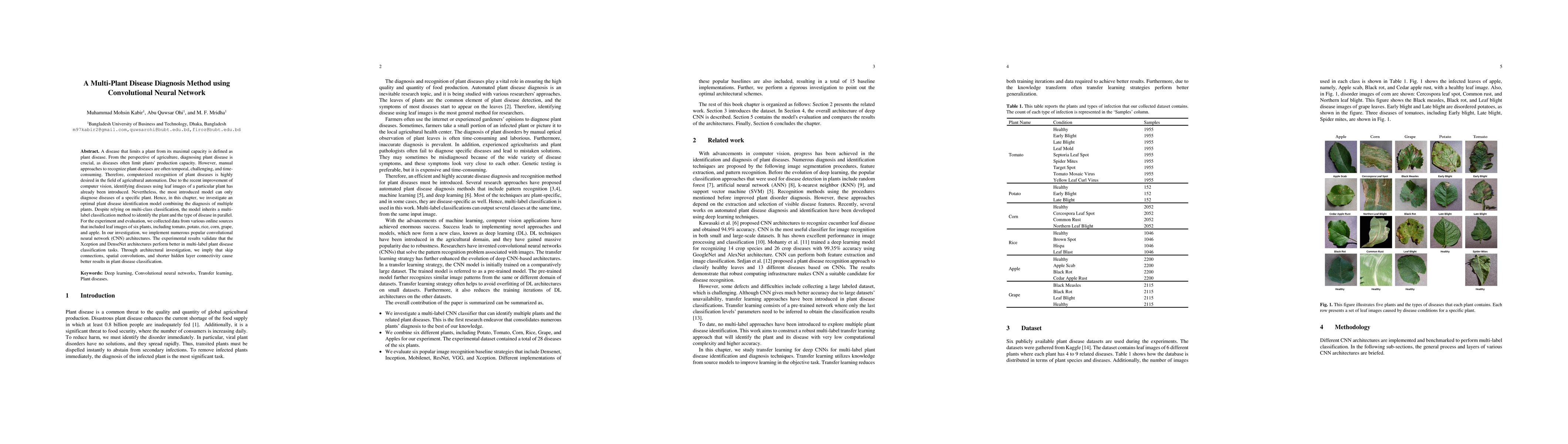 This paper proposes a multi-plant disease diagnosis method using convolutional neural networks (CNNs) to identify diseases across multiple plant species. The study finds that the Xception and DenseNet architectures outperform others in multi-label classification tasks, attributing better performance to skip connections and spatial convolutions.