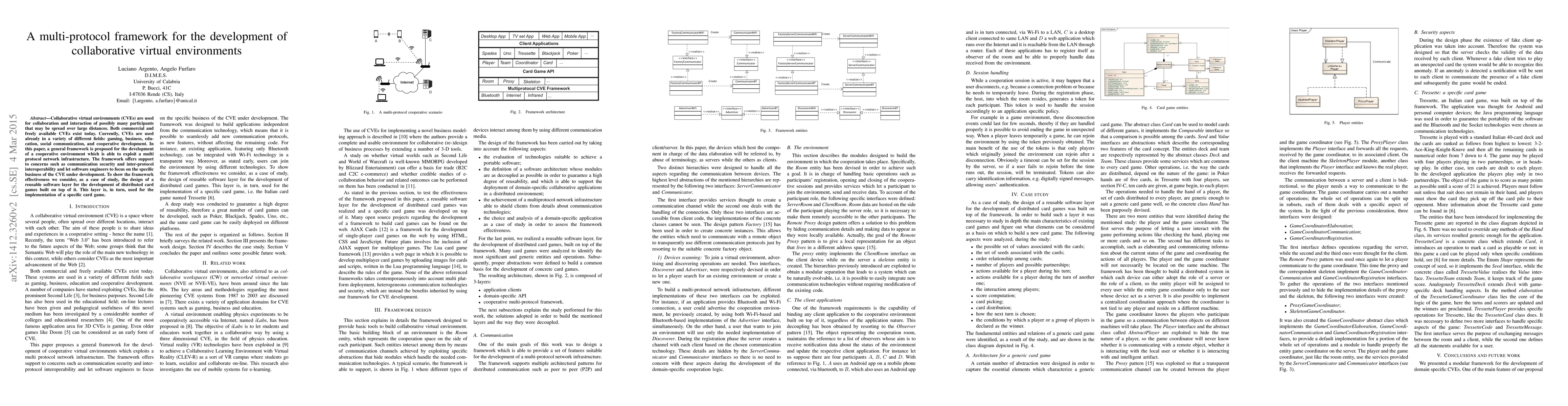 Collaborative virtual environments (CVEs) are used for collaboration and interaction of possibly many participants that may be spread over large distances. Both commercial and freely available CVEs exist today. Currently, CVEs are used already in a variety of different fields: gaming, business, education, social communication, and cooperative development. In this paper, a general framework is proposed for the development of a cooperative environment which is able to exploit a multi protocol network infrastructure. The framework offers support to concerns such as communication security and inter-protocol interoperability and let software engineers to focus on the specific business of the CVE under development. To show the framework effectiveness we consider, as a case of study, the design of a reusable software layer for the development of distributed card games built on top of it. This layer is, in turn, used for the implementation of a specific card game.