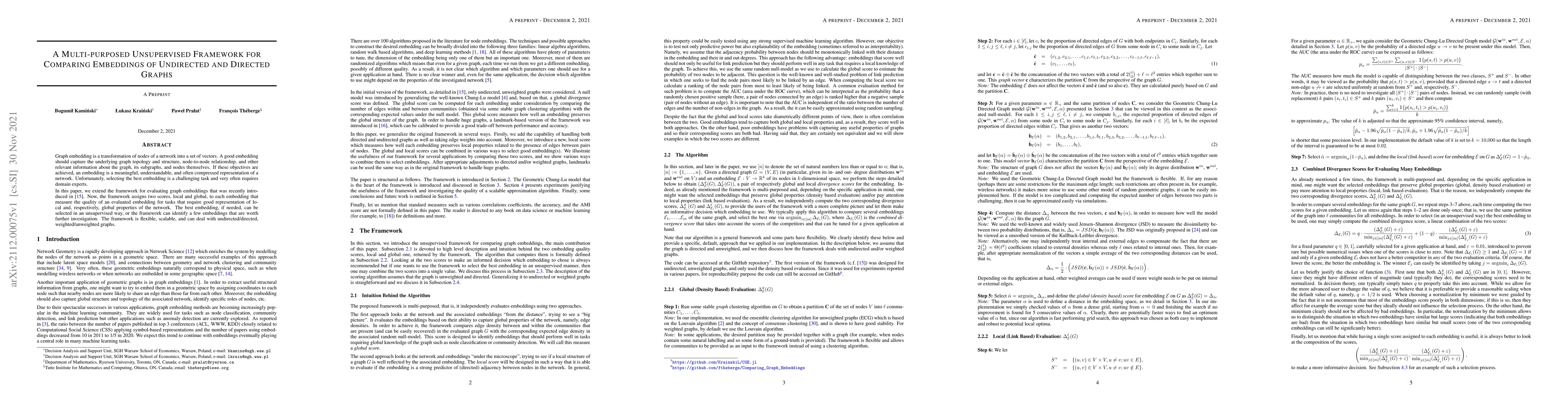 Graph embedding is a transformation of nodes of a network into a set of vectors. A good embedding should capture the underlying graph topology and structure, node-to-node relationship, and other relevant information about the graph, its subgraphs, and nodes themselves. If these objectives are achieved, an embedding is a meaningful, understandable, and often compressed representation of a network. Unfortunately, selecting the best embedding is a challenging task and very often requires domain experts. In this paper, we extend the framework for evaluating graph embeddings that was recently introduced by the authors. Now, the framework assigns two scores, local and global, to each embedding that measure the quality of an evaluated embedding for tasks that require good representation of local and, respectively, global properties of the network. The best embedding, if needed, can be selected in an unsupervised way, or the framework can identify a few embeddings that are worth further investigation. The framework is flexible, scalable, and can deal with undirected/directed, weighted/unweighted graphs.