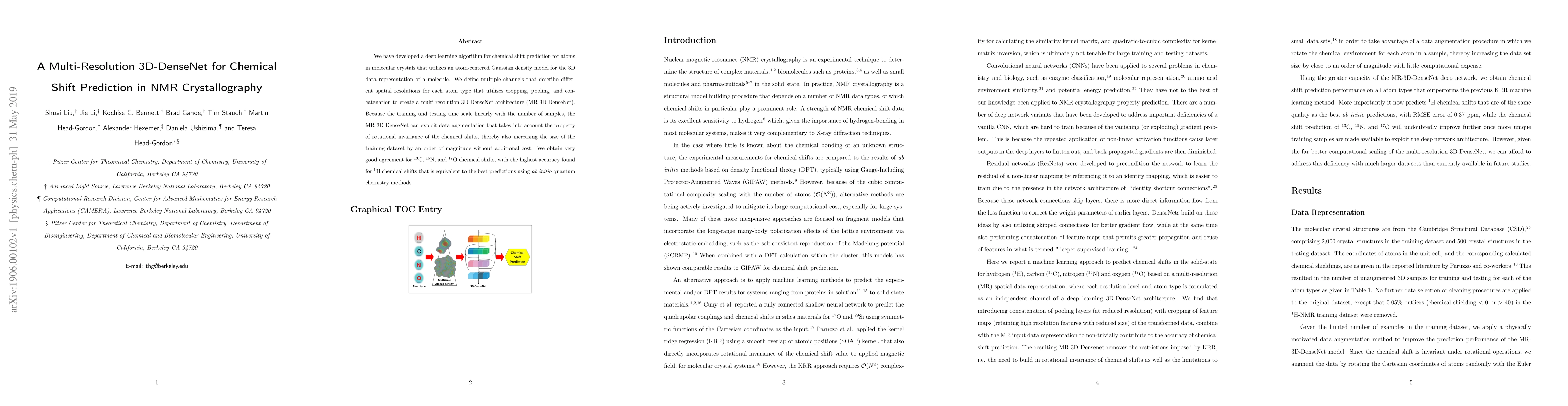 The research presents a deep learning algorithm, MR-3D-DenseNet, for predicting chemical shifts in molecular crystals using an atom-centered Gaussian density model. The architecture utilizes multi-resolution 3D-DenseNet with cropping, pooling, and concatenation to handle various spatial resolutions for different atom types.