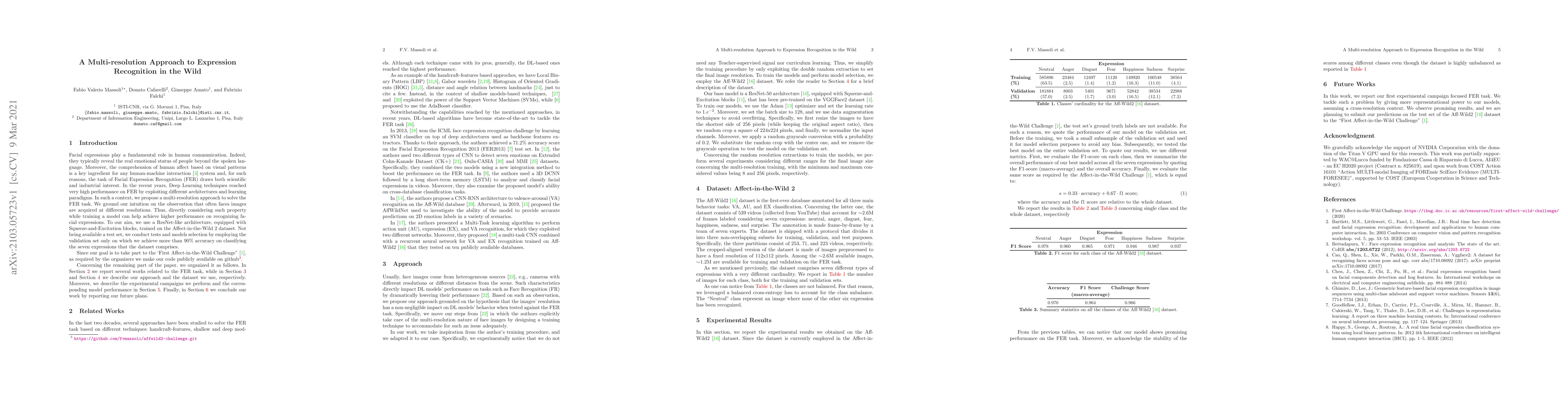 Facial expressions play a fundamental role in human communication. Indeed, they typically reveal the real emotional status of people beyond the spoken language. Moreover, the comprehension of human affect based on visual patterns is a key ingredient for any human-machine interaction system and, for such reasons, the task of Facial Expression Recognition (FER) draws both scientific and industrial interest. In the recent years, Deep Learning techniques reached very high performance on FER by exploiting different architectures and learning paradigms. In such a context, we propose a multi-resolution approach to solve the FER task. We ground our intuition on the observation that often faces images are acquired at different resolutions. Thus, directly considering such property while training a model can help achieve higher performance on recognizing facial expressions. To our aim, we use a ResNet-like architecture, equipped with Squeeze-and-Excitation blocks, trained on the Affect-in-the-Wild 2 dataset. Not being available a test set, we conduct tests and models selection by employing the validation set only on which we achieve more than 90\% accuracy on classifying the seven expressions that the dataset comprises.