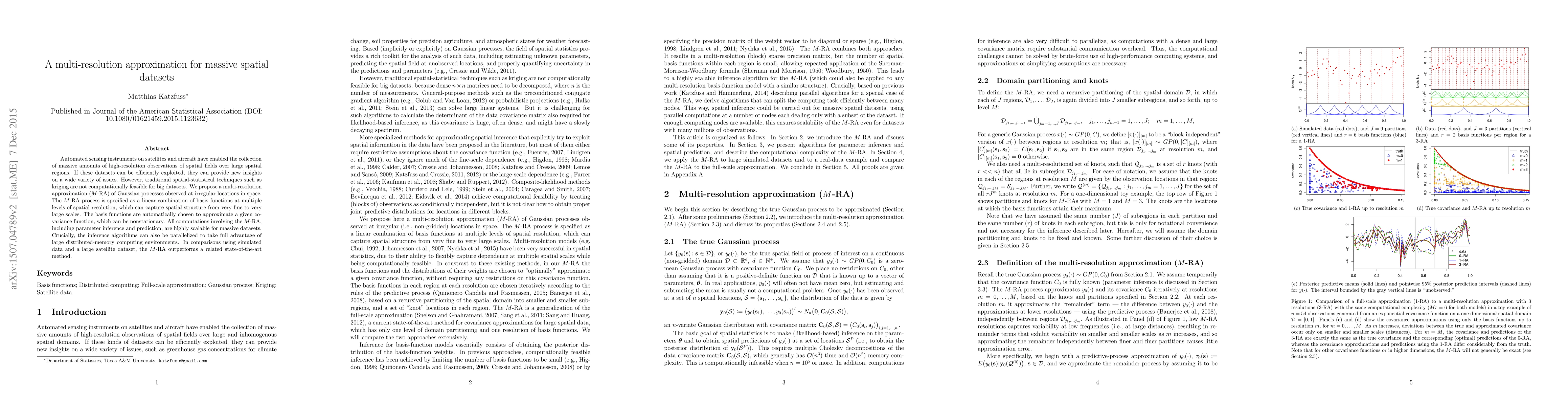 This paper proposes a multi-resolution approximation (M-RA) method for efficiently processing massive spatial datasets from satellite and aircraft observations. The M-RA method, scalable and parallelizable, outperforms traditional kriging techniques by leveraging a linear combination of basis functions at various spatial resolutions.