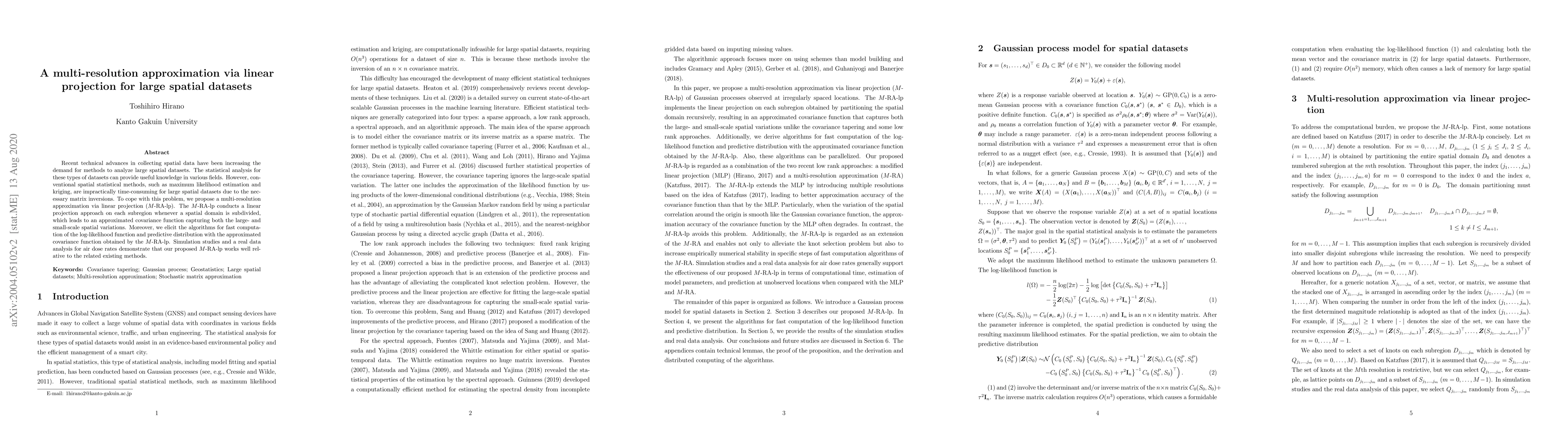 This paper proposes a multi-resolution approximation via linear projection ($M$-RA-lp) to efficiently analyze large spatial datasets, addressing the computational inefficiency of conventional methods. The $M$-RA-lp method approximates covariance functions through linear projection on subregions, enabling fast computation of log-likelihood and predictive distribution.