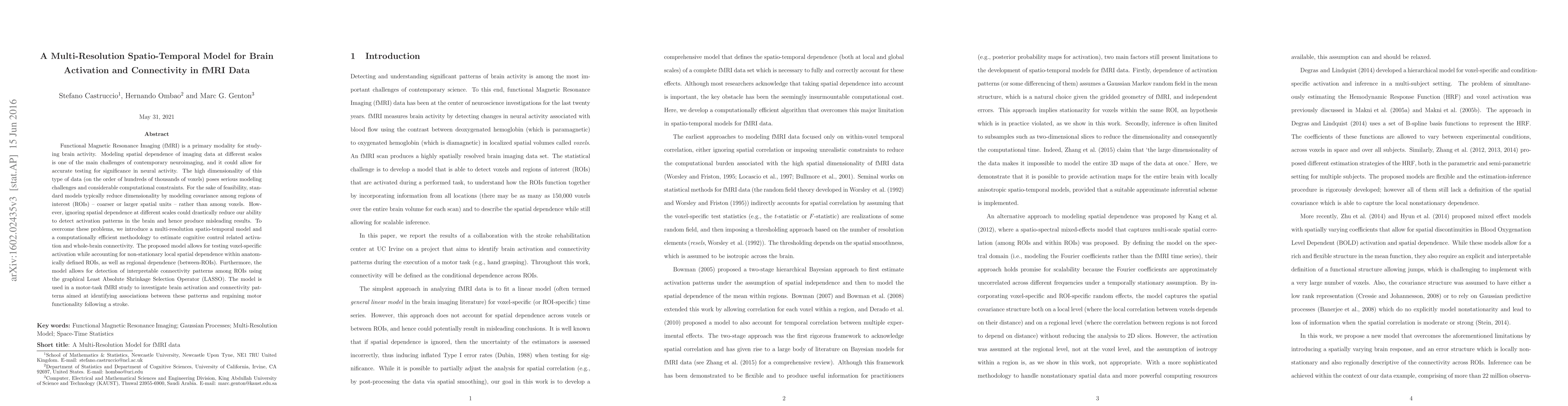 Functional Magnetic Resonance Imaging (fMRI) is a primary modality for studying brain activity. Modeling spatial dependence of imaging data at different scales is one of the main challenges of contemporary neuroimaging, and it could allow for accurate testing for significance in neural activity. The high dimensionality of this type of data (on the order of hundreds of thousands of voxels) poses serious modeling challenges and considerable computational constraints. For the sake of feasibility, standard models typically reduce dimensionality by modeling covariance among regions of interest (ROIs) -- coarser or larger spatial units -- rather than among voxels. However, ignoring spatial dependence at different scales could drastically reduce our ability to detect activation patterns in the brain and hence produce misleading results. To overcome these problems, we introduce a multi-resolution spatio-temporal model and a computationally efficient methodology to estimate cognitive control related activation and whole-brain connectivity. The proposed model allows for testing voxel-specific activation while accounting for non-stationary local spatial dependence within anatomically defined ROIs, as well as regional dependence (between-ROIs). Furthermore, the model allows for detection of interpretable connectivity patterns among ROIs using the graphical Least Absolute Shrinkage Selection Operator (LASSO). The model is used in a motor-task fMRI study to investigate brain activation and connectivity patterns aimed at identifying associations between these patterns and regaining motor functionality following a stroke.