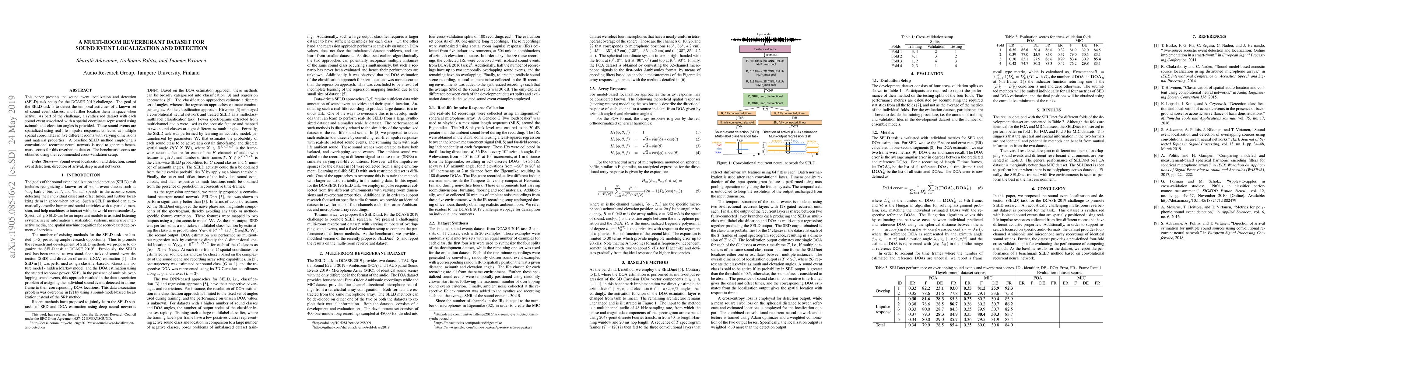 This paper introduces a multi-room reverberant dataset for sound event localization and detection, featuring spatialized sound events using real-life impulse responses from five rooms. A convolutional recurrent neural network baseline achieves benchmark scores for the dataset.