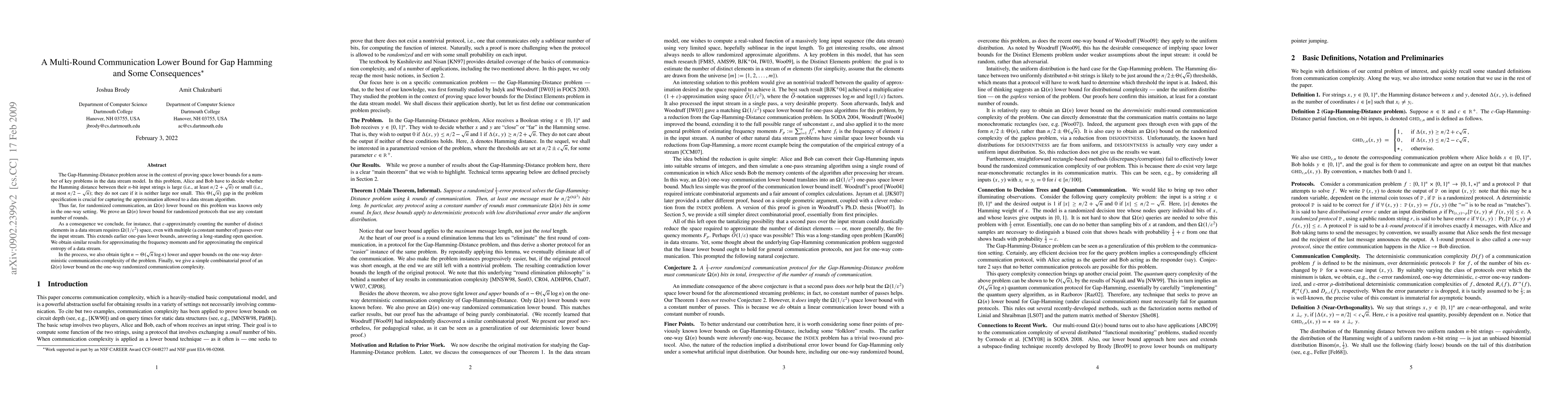 The Gap-Hamming-Distance problem arose in the context of proving space lower bounds for a number of key problems in the data stream model. In this problem, Alice and Bob have to decide whether the Hamming distance between their $n$-bit input strings is large (i.e., at least $n/2 + \sqrt n$) or small (i.e., at most $n/2 - \sqrt n$); they do not care if it is neither large nor small. This $\Theta(\sqrt n)$ gap in the problem specification is crucial for capturing the approximation allowed to a data stream algorithm. Thus far, for randomized communication, an $\Omega(n)$ lower bound on this problem was known only in the one-way setting. We prove an $\Omega(n)$ lower bound for randomized protocols that use any constant number of rounds. As a consequence we conclude, for instance, that $\epsilon$-approximately counting the number of distinct elements in a data stream requires $\Omega(1/\epsilon^2)$ space, even with multiple (a constant number of) passes over the input stream. This extends earlier one-pass lower bounds, answering a long-standing open question. We obtain similar results for approximating the frequency moments and for approximating the empirical entropy of a data stream. In the process, we also obtain tight $n - \Theta(\sqrt{n}\log n)$ lower and upper bounds on the one-way deterministic communication complexity of the problem. Finally, we give a simple combinatorial proof of an $\Omega(n)$ lower bound on the one-way randomized communication complexity.
