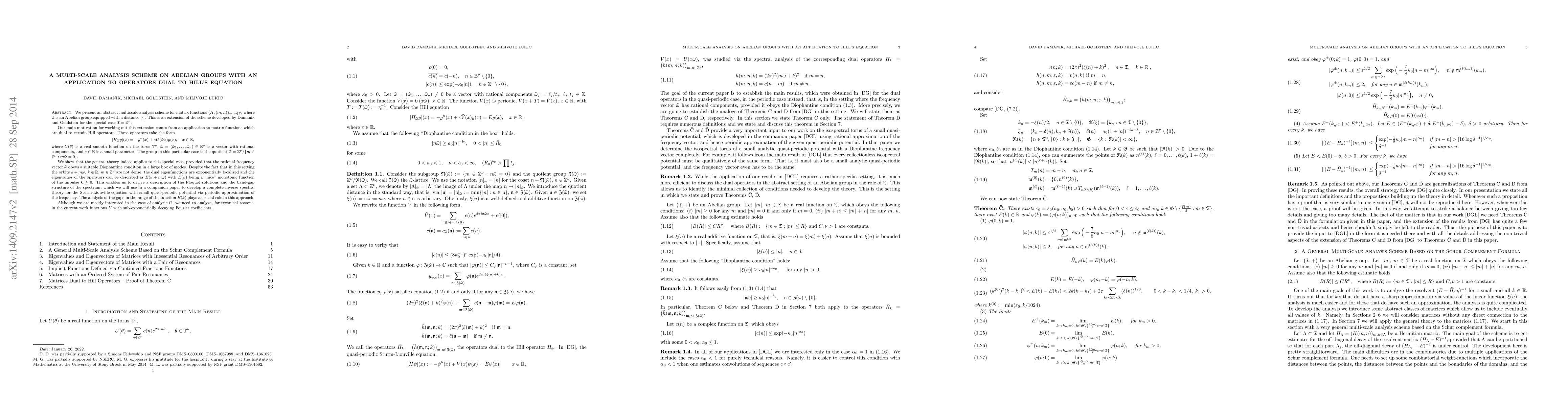 We present an abstract multiscale analysis scheme for matrix functions $(H_{\varepsilon}(m,n))_{m,n\in \mathfrak{T}}$, where $\mathfrak{T}$ is an Abelian group equipped with a distance $|\cdot|$. This is an extension of the scheme developed by Damanik and Goldstein for the special case $\mathfrak{T} = \mathbb{Z}^\nu$. Our main motivation for working out this extension comes from an application to matrix functions which are dual to certain Hill operators. These operators take the form $H_{\tilde\omega}=-\frac{d^2}{dx^2} + \varepsilon U(\tilde\omega x)$, where $U$ is a real smooth function on the torus $\mathbb{T}^\nu$, $\tilde\omega\in \mathbb{R}^\nu$ is a vector with rational components, and $\varepsilon$ is a small parameter. The group in this particular case is the quotient $\mathfrak{T} = \mathbb{Z}^\nu/\{m\in\mathbb{Z}^\nu:m\tilde\omega=0\}$. We show that the general theory indeed applies to this special case, provided that the rational frequency vector $\tilde\omega$ obeys a suitable Diophantine condition in a large box of modes. Despite the fact that in this setting the orbits $k + m\omega$, $k \in \mathbb{R}$, $m\in\mathbb{Z}^\nu$ are not dense, the dual eigenfunctions are exponentially localized and the eigenvalues of the operators can be described as $E(k+m\omega)$ with $E(k)$ being a "nice" monotonic function of the impulse $k \ge 0$. This enables us to derive a description of the Floquet solutions and the band-gap structure of the spectrum, which we will use in a companion paper to develop a complete inverse spectral theory for the Sturm-Liouville equation with small quasi-periodic potential via periodic approximation of the frequency. The analysis of the gaps in the range of the function $E(k)$ plays a crucial role in this approach.