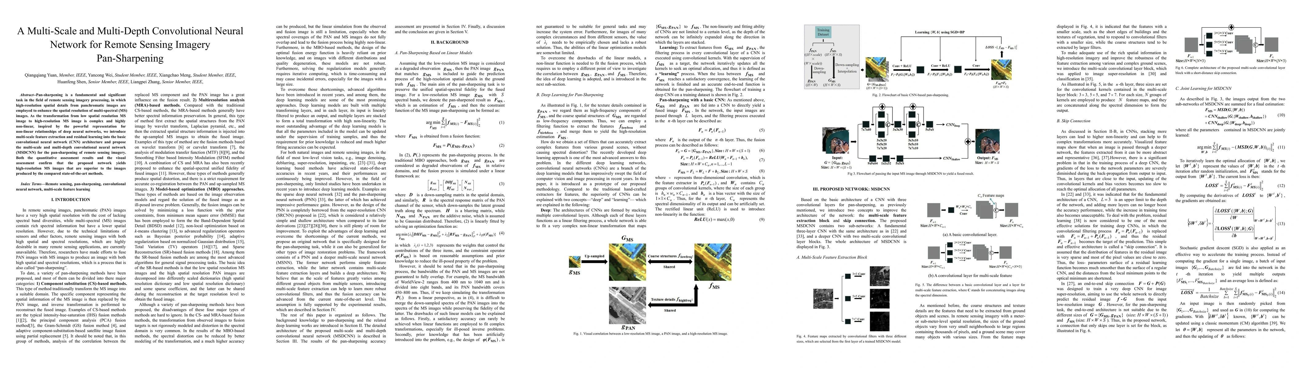 This paper proposes a multi-scale and multi-depth convolutional neural network (MSDCNN) for remote sensing imagery pan-sharpening, integrating multi-scale feature extraction and residual learning to improve spatial resolution. The results show that MSDCNN outperforms existing methods in both quantitative and visual assessments.