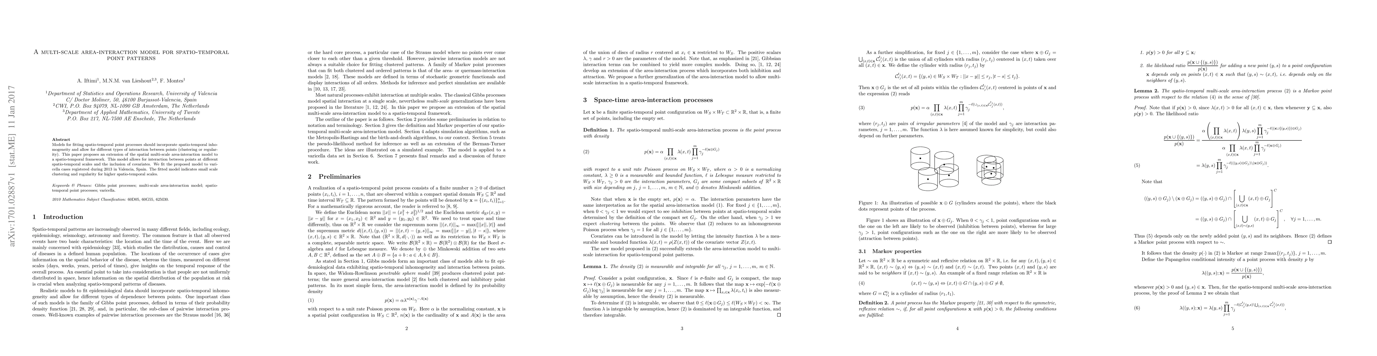 This paper introduces a spatio-temporal extension of the multi-scale area-interaction model to analyze point patterns, accommodating various interaction types and covariates. Applied to varicella cases in Valencia, Spain, the model reveals small-scale clustering and larger-scale regularity.