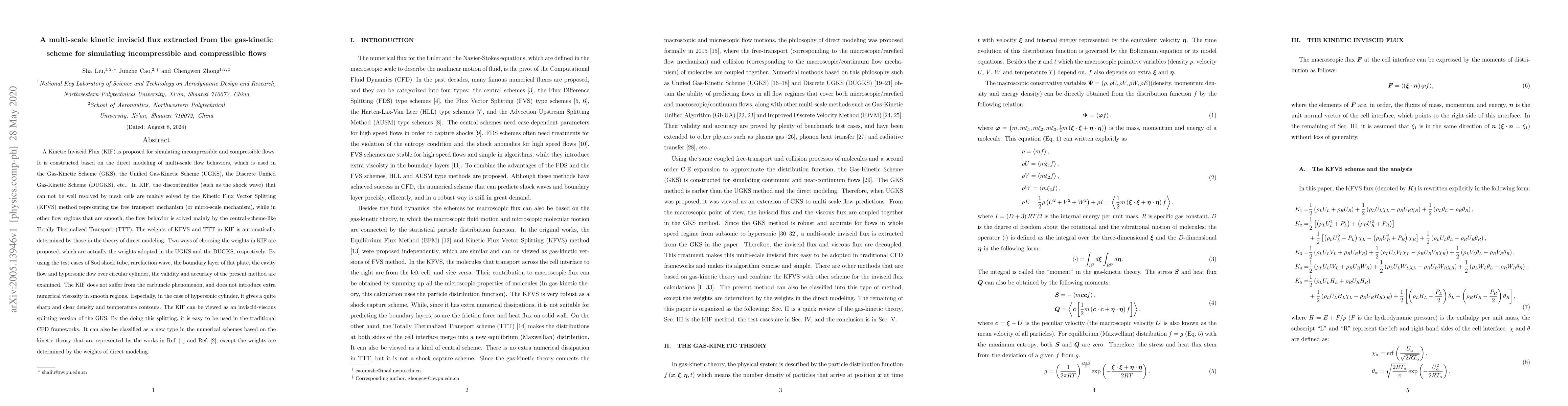 A Kinetic Inviscid Flux (KIF) is proposed for simulating incompressible and compressible flows. It is constructed based on the direct modeling of multi-scale flow behaviors, which is used in the Gas-Kinetic Scheme (GKS), the Unified Gas-Kinetic Scheme (UGKS), the Discrete Unified Gas-Kinetic Scheme (DUGKS), etc.. In KIF, the discontinuities (such as the shock wave) that can not be well resolved by mesh cells are mainly solved by the Kinetic Flux Vector Splitting (KFVS) method representing the free transport mechanism (or micro-scale mechanism), while in other flow regions that are smooth, the flow behavior is solved mainly by the central-scheme-like Totally Thermalized Transport (TTT). The weights of KFVS and TTT in KIF is automatically determined by those in the theory of direct modeling. Two ways of choosing the weights in KIF are proposed, which are actually the weights adopted in the UGKS and the DUGKS, respectively. By using the test cases of Sod shock tube, rarefaction wave, the boundary layer of flat plate, the cavity flow and hypersonic flow over circular cylinder, the validity and accuracy of the present method are examined. The KIF does not suffer from the carbuncle phenomenon, and does not introduce extra numerical viscosity in smooth regions. Especially, in the case of hypersonic cylinder, it gives a quite sharp and clear density and temperature contours. The KIF can be viewed as an inviscid-viscous splitting version of the GKS. By the doing this splitting, it is easy to be used in the traditional CFD frameworks. It can also be classified as a new type in the numerical schemes based on the kinetic theory that are represented by the works in Ref. \cite{SunA} and Ref. \cite{ohwada2018a}, except the weights are determined by the weights of direct modeling.