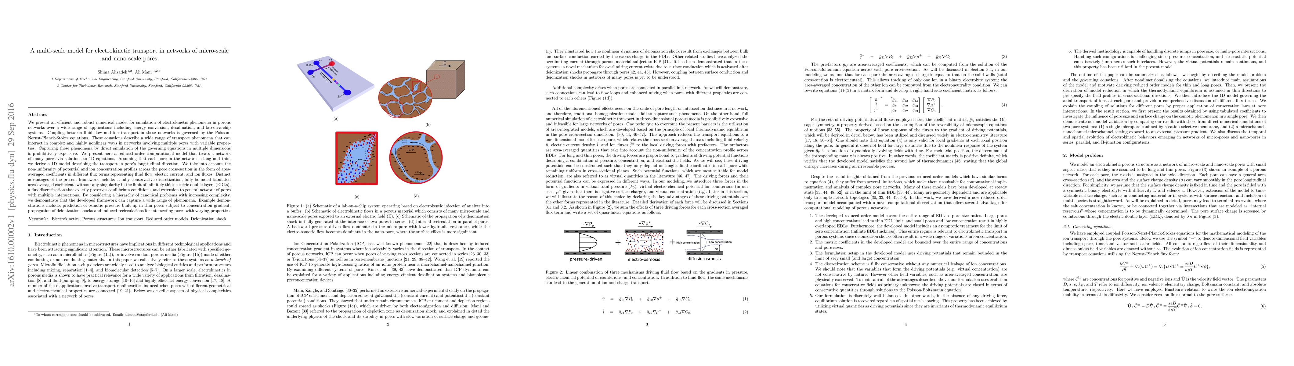 This paper introduces a reduced order computational model for simulating electrokinetic transport in networks of micro-scale and nano-scale pores, using a 1D approximation to manage complex interactions. The model effectively captures phenomena like fluid flow, ion transport, and electric current, demonstrating applications in energy conversion, desalination, and lab-on-a-chip systems.