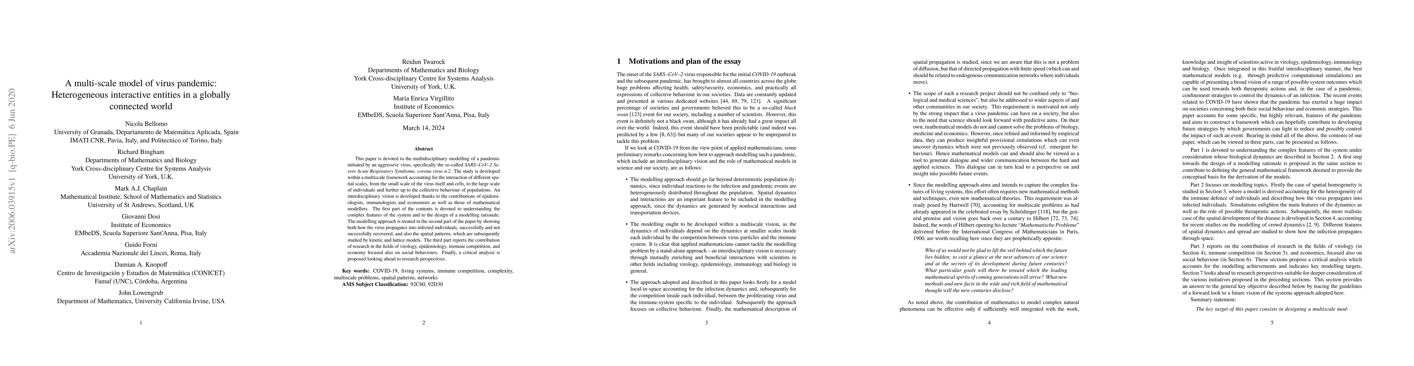 This paper is devoted to the multidisciplinary modelling of a pandemic initiated by an aggressive virus, specifically the so-called \textit{SARS--CoV--2 Severe Acute Respiratory Syndrome, corona virus n.2}. The study is developed within a multiscale framework accounting for the interaction of different spatial scales, from the small scale of the virus itself and cells, to the large scale of individuals and further up to the collective behaviour of populations. An interdisciplinary vision is developed thanks to the contributions of epidemiologists, immunologists and economists as well as those of mathematical modellers. The first part of the contents is devoted to understanding the complex features of the system and to the design of a modelling rationale. The modelling approach is treated in the second part of the paper by showing both how the virus propagates into infected individuals, successfully and not successfully recovered, and also the spatial patterns, which are subsequently studied by kinetic and lattice models. The third part reports the contribution of research in the fields of virology, epidemiology, immune competition, and economy focused also on social behaviours. Finally, a critical analysis is proposed looking ahead to research perspectives.