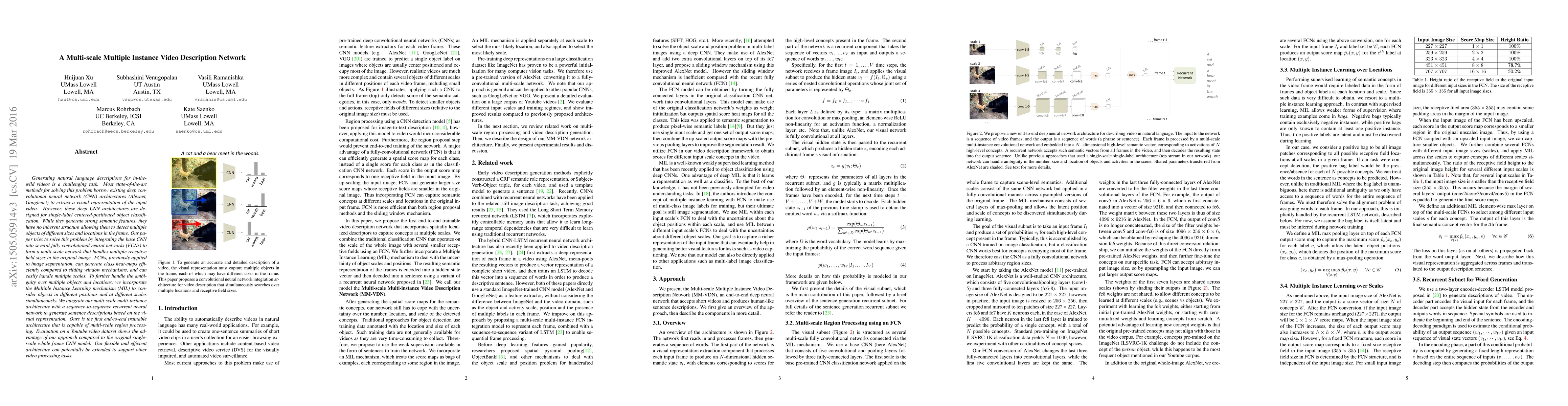 This paper proposes a multi-scale multiple instance video description network that integrates fully convolutional neural networks (FCNs) and Multiple Instance Learning (MIL) to generate natural language descriptions for videos. The approach outperforms single-scale CNN models by efficiently handling multiple objects of different sizes and locations.