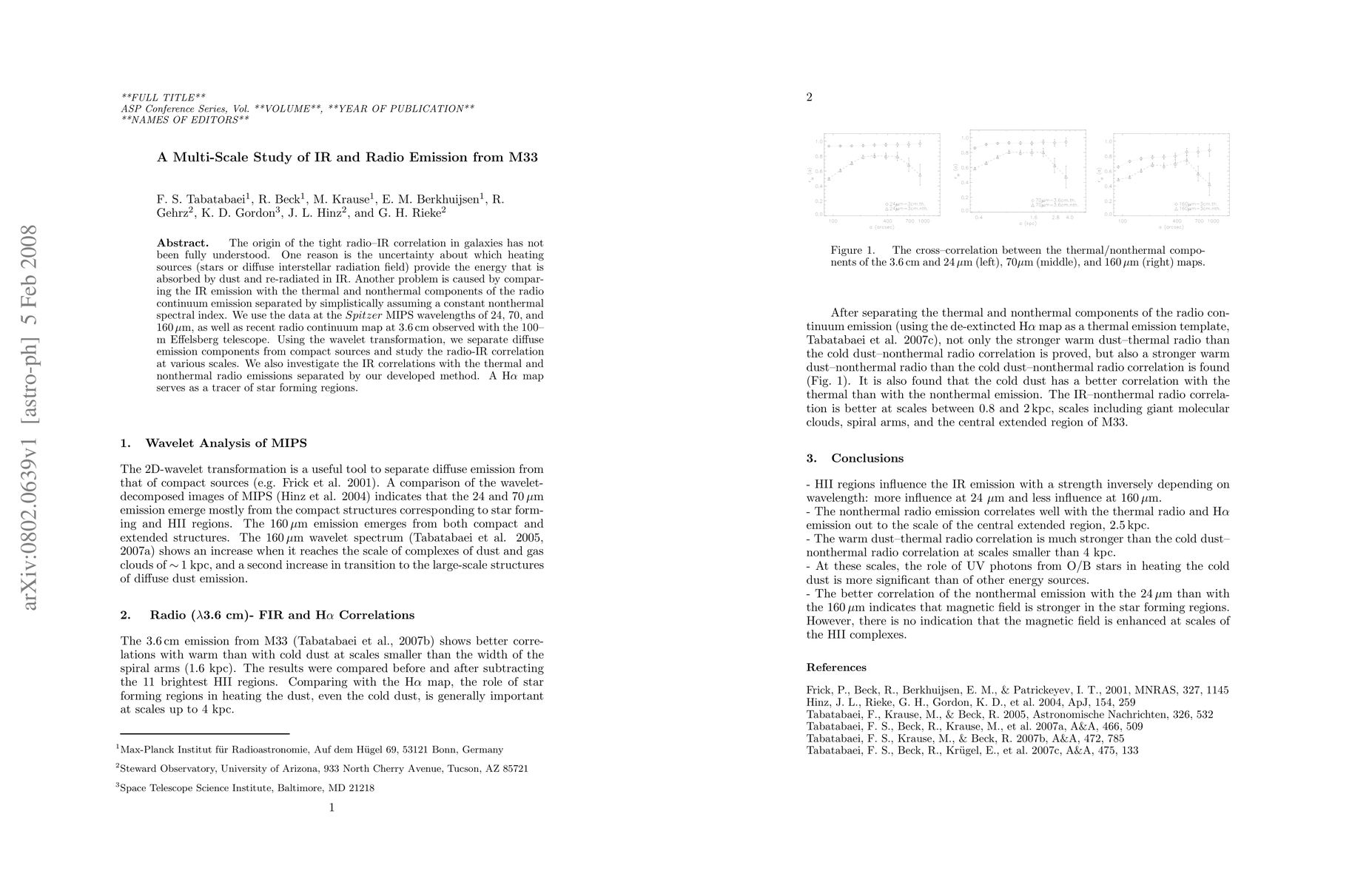 The origin of the tight radio--IR correlation in galaxies has not been fully understood. One reason is the uncertainty about which heating sources (stars or diffuse interstellar radiation field)provide the energy that is absorbed by dust and re-radiated in IR. Another problem is caused by comparing the IR emission with the thermal and nonthermal components of the radio continuum emission separated by simplistically assuming a constant nonthermal spectral index. We use the data at the $Spitzer$ MIPS wavelengths of 24, 70, and 160 $\mu$m, as well as recent radio continuum map at 3.6 cm observed with the 100--m Effelsberg telescope. Using the wavelet transformation, we separate diffuse emission components from compact sources and study the radio-IR correlation at various scales. We also investigate the IR correlations with the thermal and nonthermal radio emissions separated by our developed method. A H$\alpha$ map serves as a tracer of star forming regions.