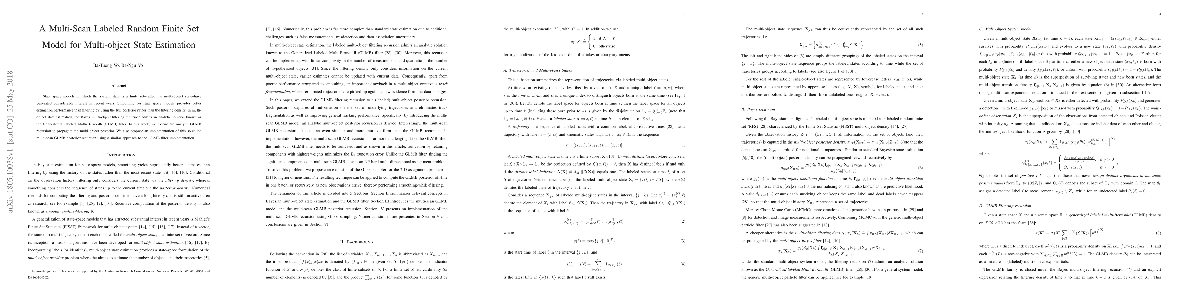 This paper extends the Generalized Labeled Multi-Bernoulli (GLMB) filter to a multi-scan labeled random finite set model for improved multi-object state estimation, utilizing smoothing techniques for better performance over filtering. The proposed multi-scan GLMB recursion aims to propagate the multi-object posterior analytically.