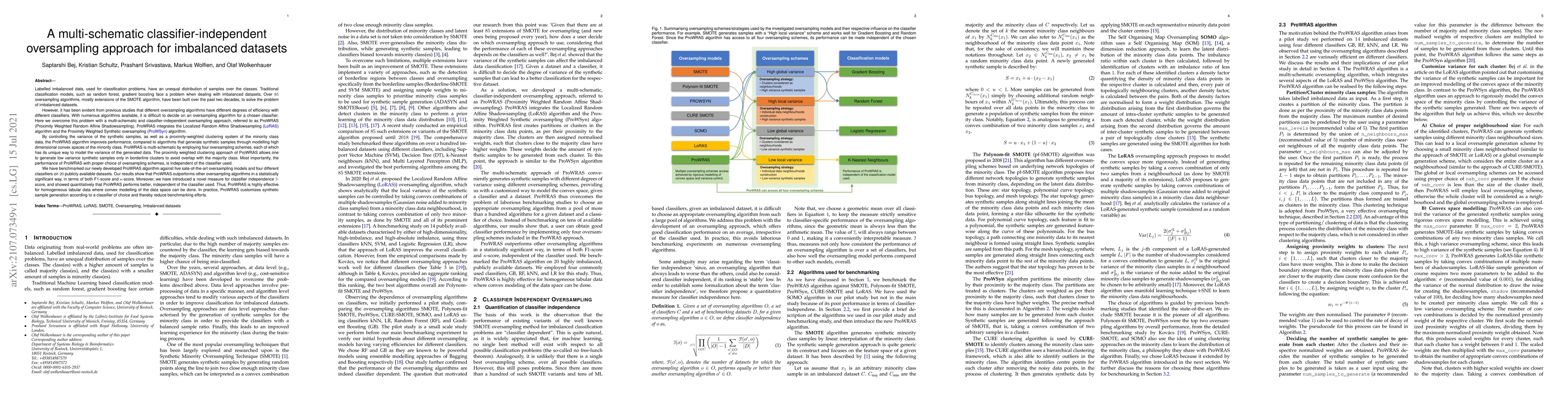 This paper introduces ProWRAS, a multi-schematic and classifier-independent oversampling approach to address imbalanced datasets. It outperforms other oversampling algorithms in benchmark tests, demonstrating superior performance in terms of F1-score and Kappa-score, and introduces a novel I-score to measure classifier independence.