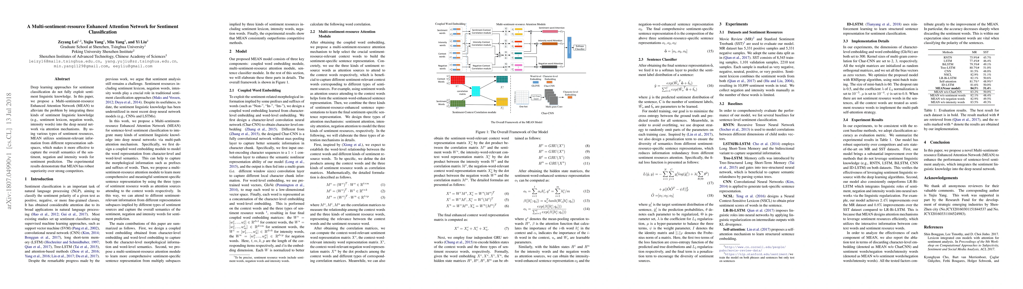 This paper proposes a Multi-sentiment-resource Enhanced Attention Network (MEAN) to improve sentiment classification by integrating sentiment lexicon, negation words, and intensity words into a deep learning model using attention mechanisms. Experimental results show MEAN outperforms other methods by effectively capturing sentiment nuances.