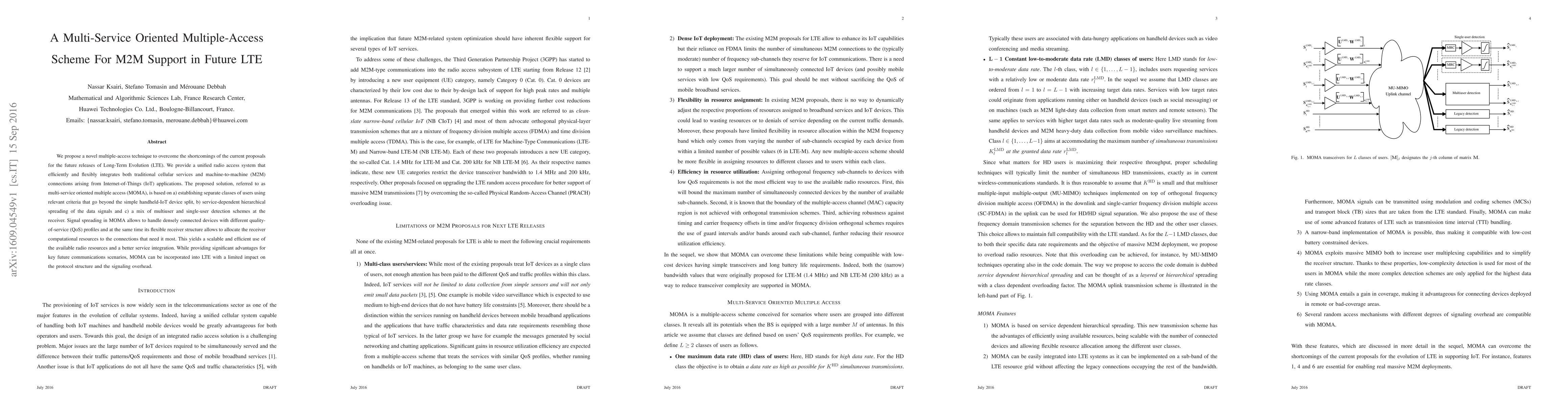 The paper proposes MOMA, a multi-service oriented multiple-access technique for future LTE that integrates traditional cellular and machine-to-machine communications efficiently. It achieves this through user class differentiation, service-dependent signal spreading, and adaptive detection schemes, optimizing radio resource use and service integration with minimal protocol changes.