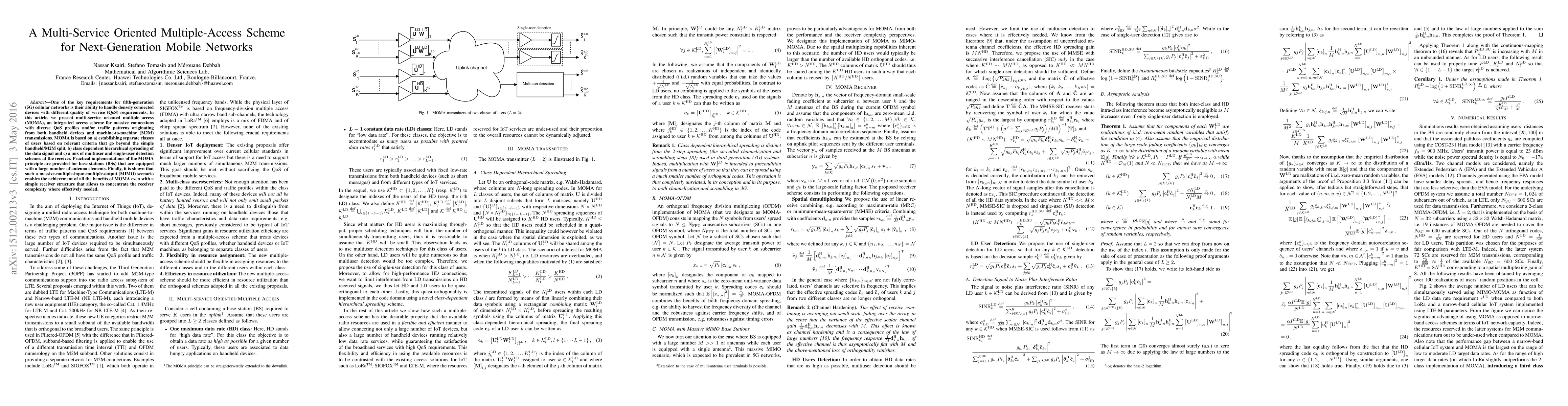This paper introduces MOMA, a multi-service oriented multiple-access scheme for 5G networks, designed to manage diverse QoS requirements from both handheld and machine-to-machine devices. It leverages class-based user separation, hierarchical data spreading, and adaptive detection schemes to optimize performance in massive MIMO environments.